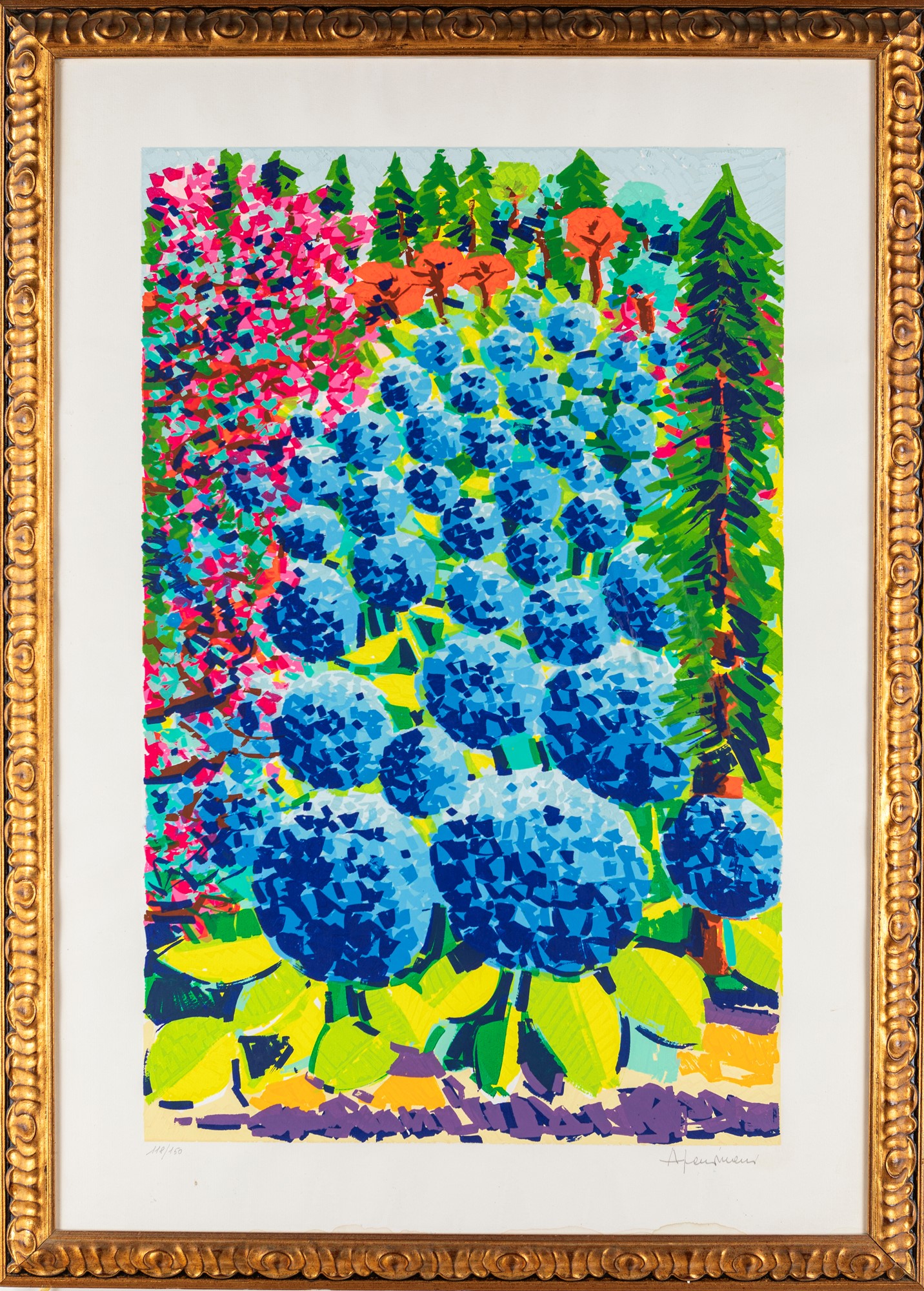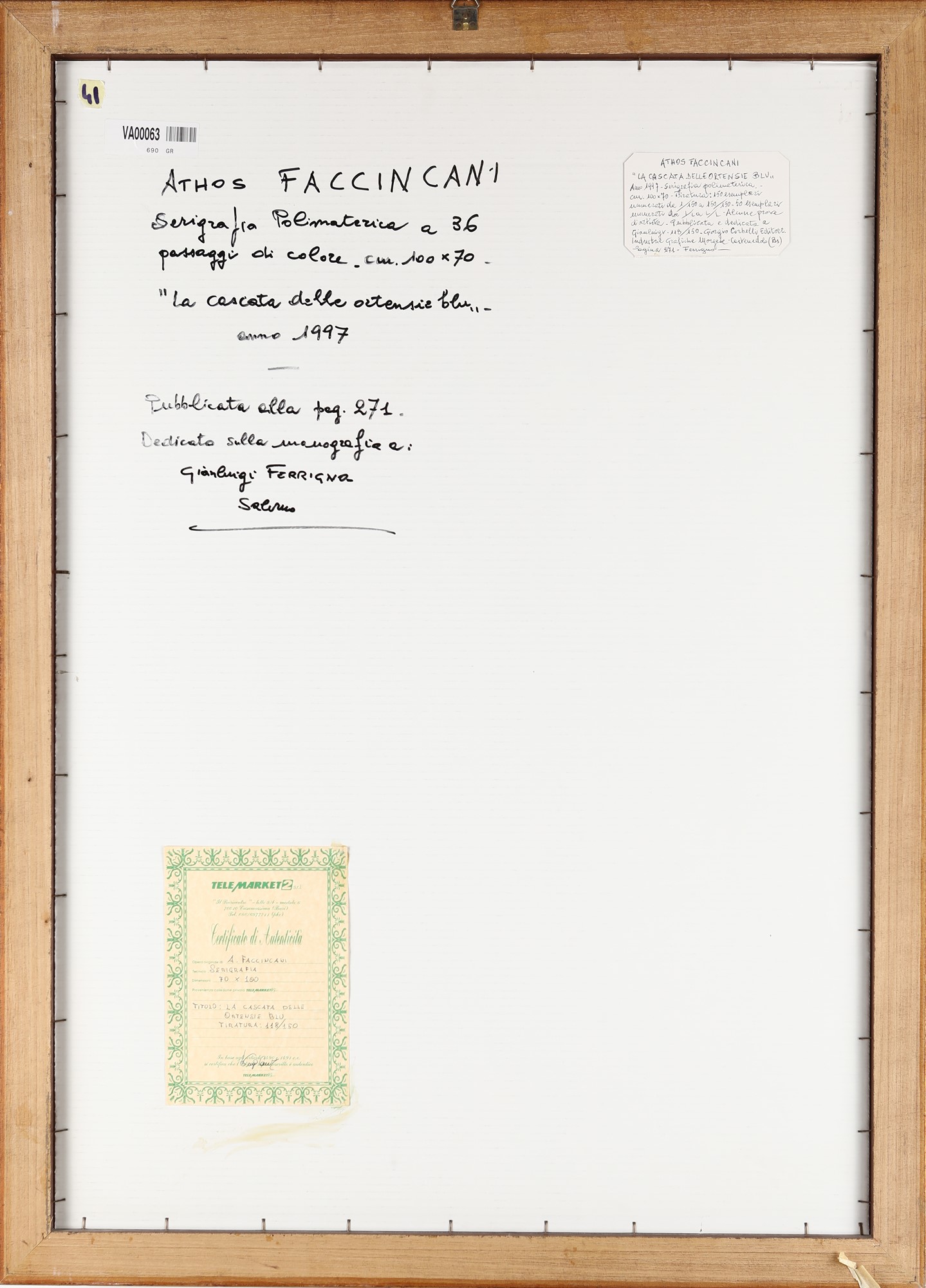 La cascata delle ortensie blu 1997 Serigrafia polimaterica cm 100x70 - in cornice cm 109x79 Firma e numerazione "Faccincani 118/150". Al verso etichetta Telemarket