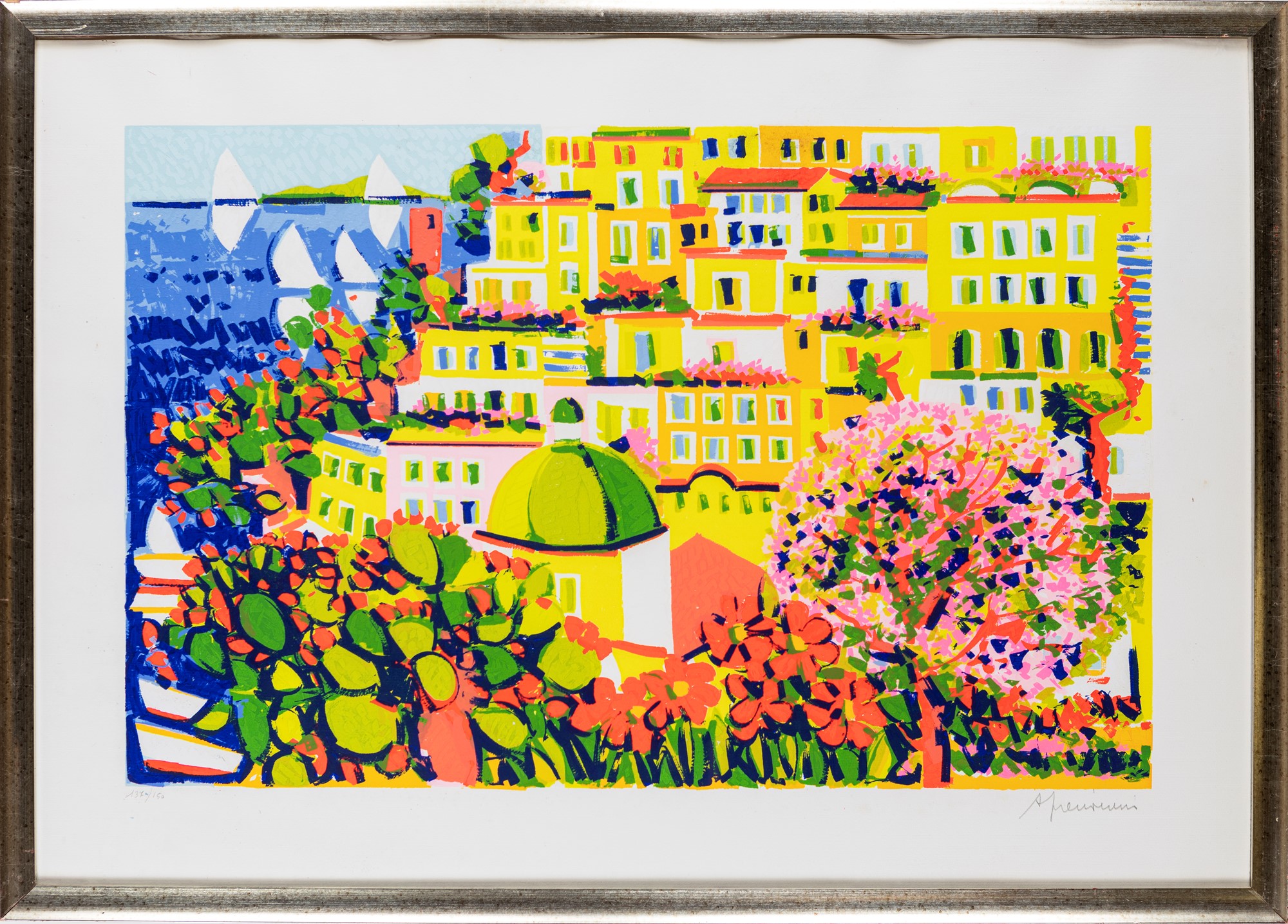 Positano con pesco 1997 Serigrafia polimaterica cm 70x100 - in cornice cm 75x105 Firma e numerazione "AFaccincani, 137/150". Al verso reca etichetta di Telemarket