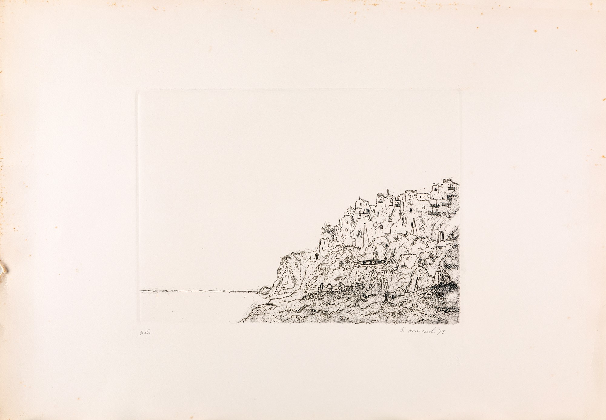 Scogliera con case e barche 1973 Acquaforte cm 50x71 Firma, data e numerazione "G. Omiccioli 73 p.d.a."
