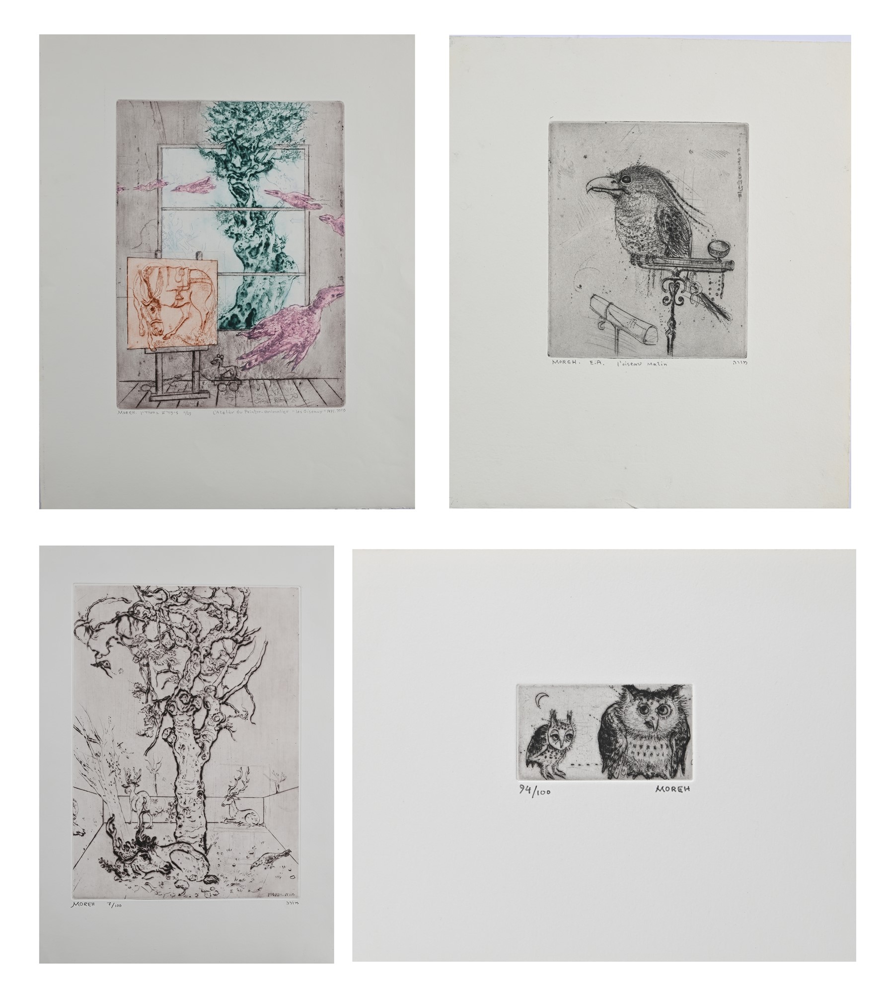 Mordecai Moreh (1937) Lotto di 4 grafiche A) due civette, acquaforte, cm...