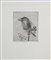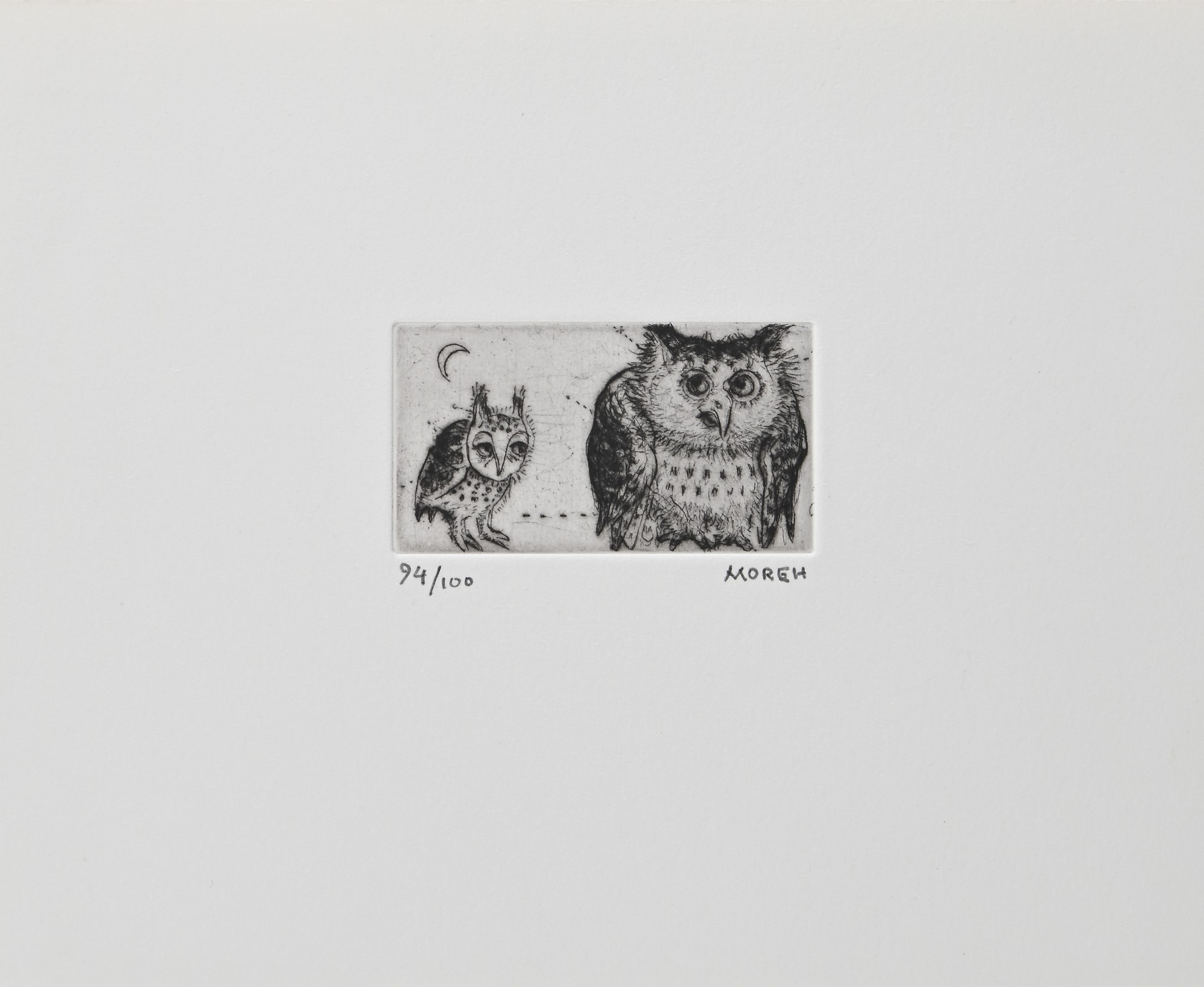 A) due civette, acquaforte, cm 17x21, firma e numerazione Moreh 94/100, entro cartellina galleria Don Chisciotte