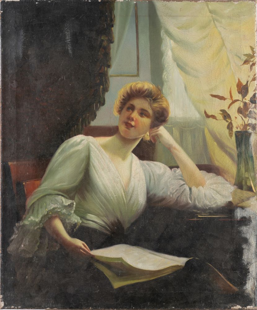 Pittore del XIX secolo. Ritratto di figura femminile seduta in un interno.