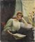 Pittore del XIX secolo. Ritratto di figura femminile seduta in un interno. Cm. 60x50. Olio su tela.
