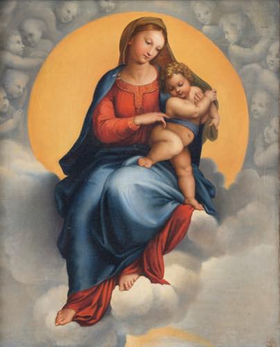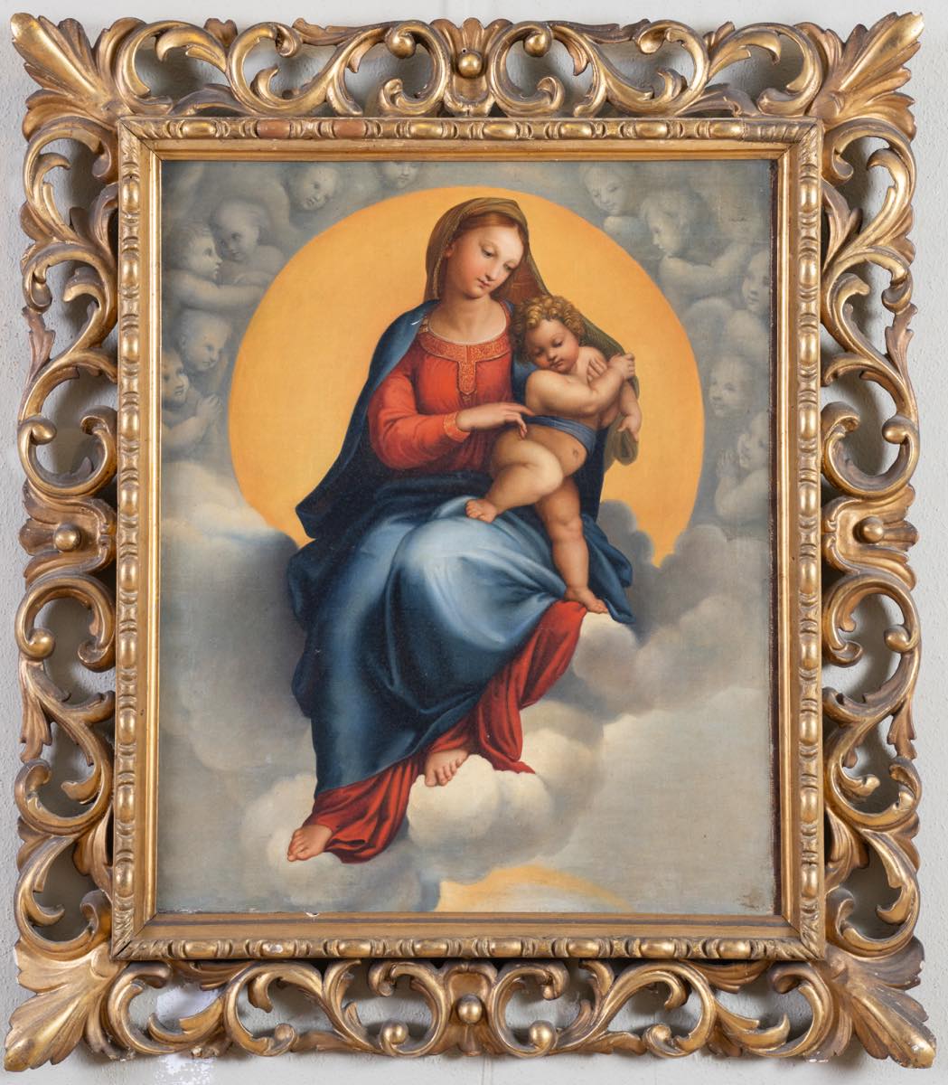 Maestro degli inizi del XIX secolo. "Madonna con Bambino”. Copia di una parte della "Madonna di Foligno" di Raffaello. Cm 63x51. Olio su tela.