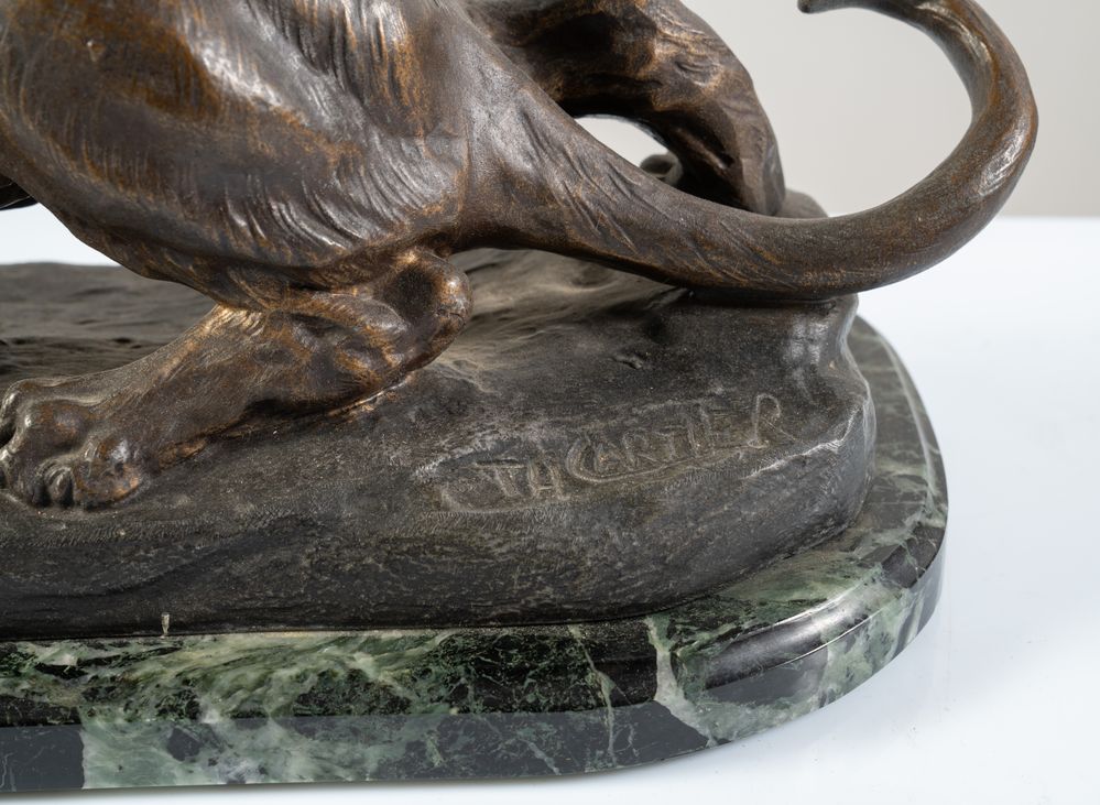 Scultura in bronzo. Basamento in bronzo su base in marmo. Firma incisa sul basamento in bronzo TH. Cartier.