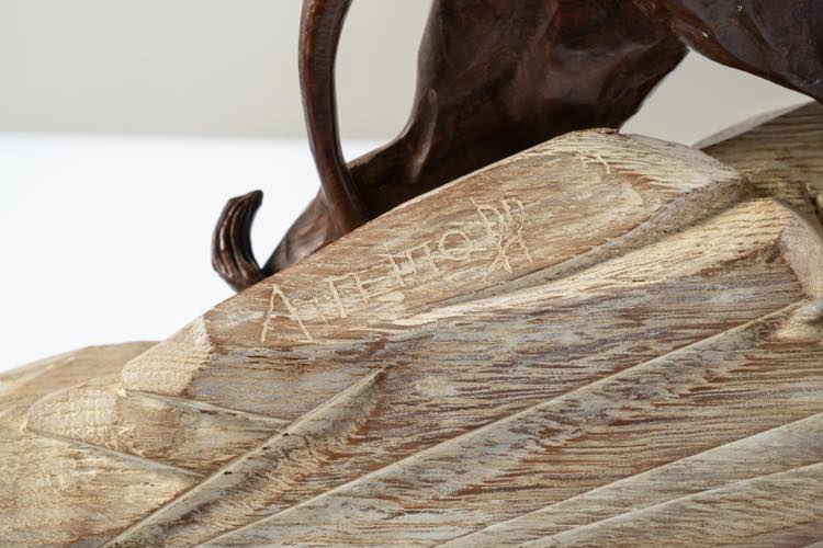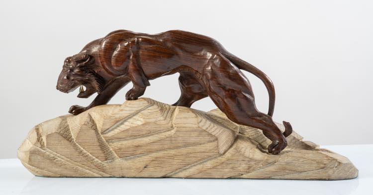 Scultura in legno bruno rossiccio e legno chiaro, raffigurante tigre che cammina su una roccia.