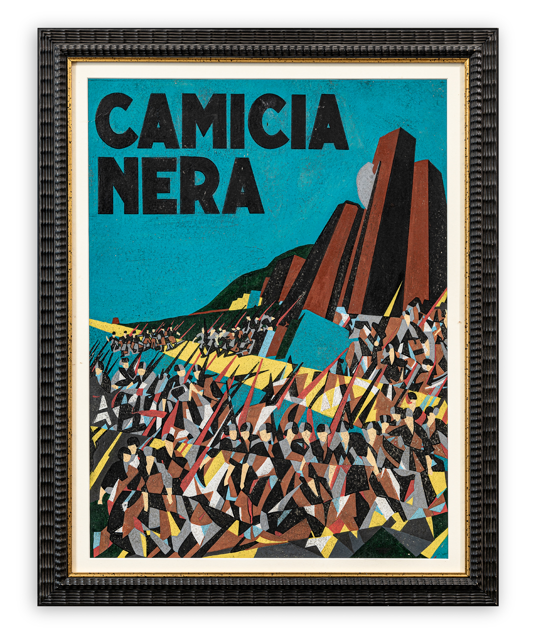 L'opera, una tempera su cartone, rappresenta il bozzetto per un manifesto propagandistico di cui, ad oggi, non si conosce la pubblicazione. Dedicato al Corpo Ausiliario delle Squadre d'Azione delle Camicie Nere, fu realizzato probabilmente su commissione. Esalta il moto della milizia verso un ideale città turrita la cui staticità contrasta col dinamismo sottostante. Notevole il rimando alle forme puntute che ben sintetizzano il messaggio subliminale di forza e volontà di azione (testo tratto dal certificato di archiviazione)