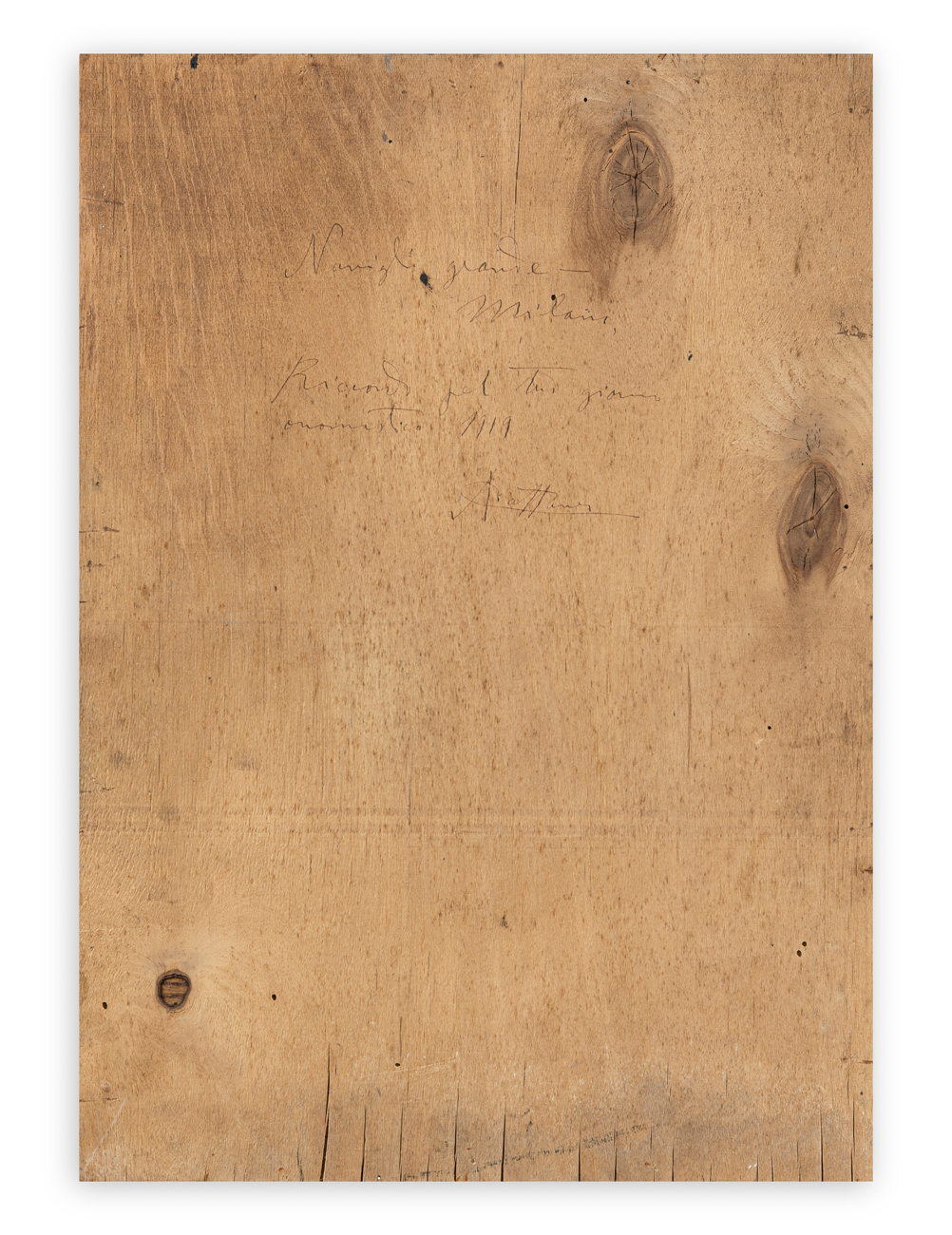 Opera senza cornice, presenta lievi difetti e tagli sulla parte inferiore della tavola