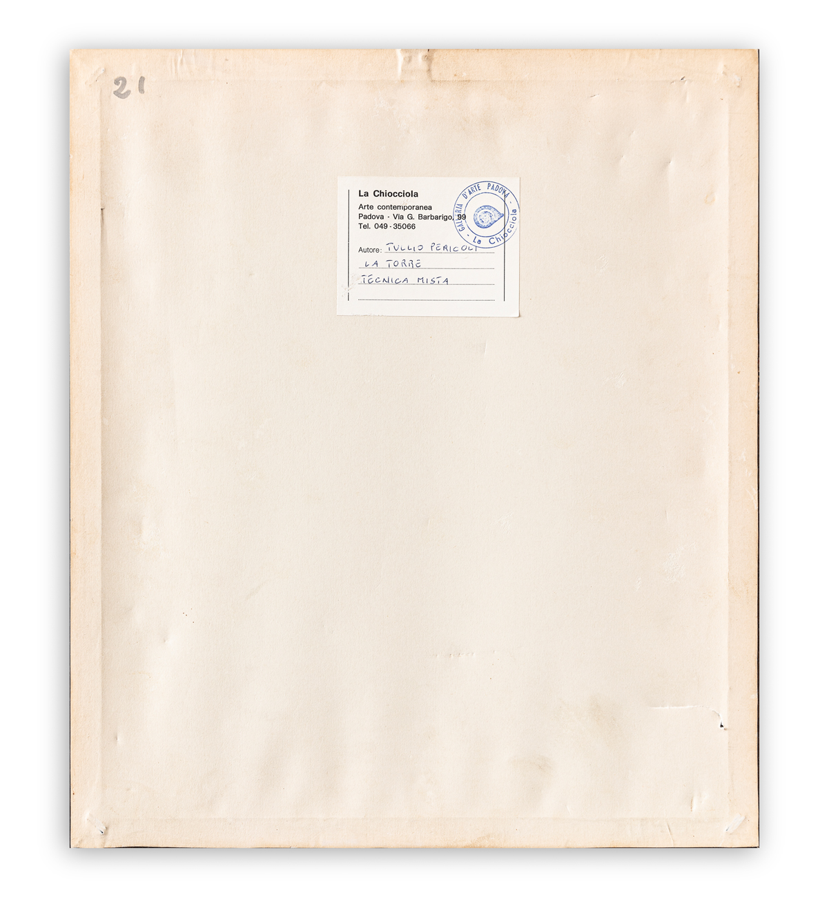Etichetta della Galleria La Chiocciola Arte Contemporanea (PD) al retro del cartone protettivo
