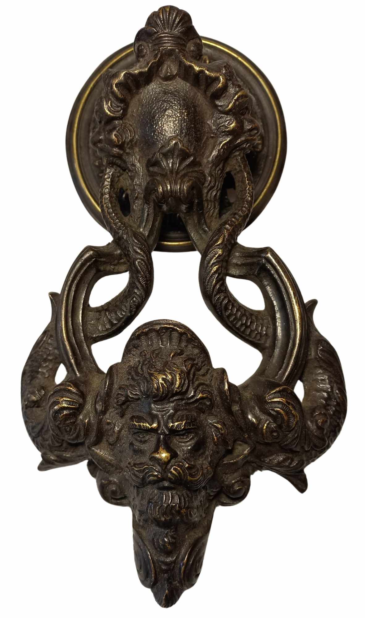 Questo fantasioso battente, o picchiotto, raffigura la testa di un uomo barbuto sorretta da una coppia di delfini che sembrano mordergli le orecchie. Le code dei delfini si intrecciano e vanno a finire nelle bocche spalancate di altri due mascheroni visti di profilo.