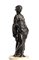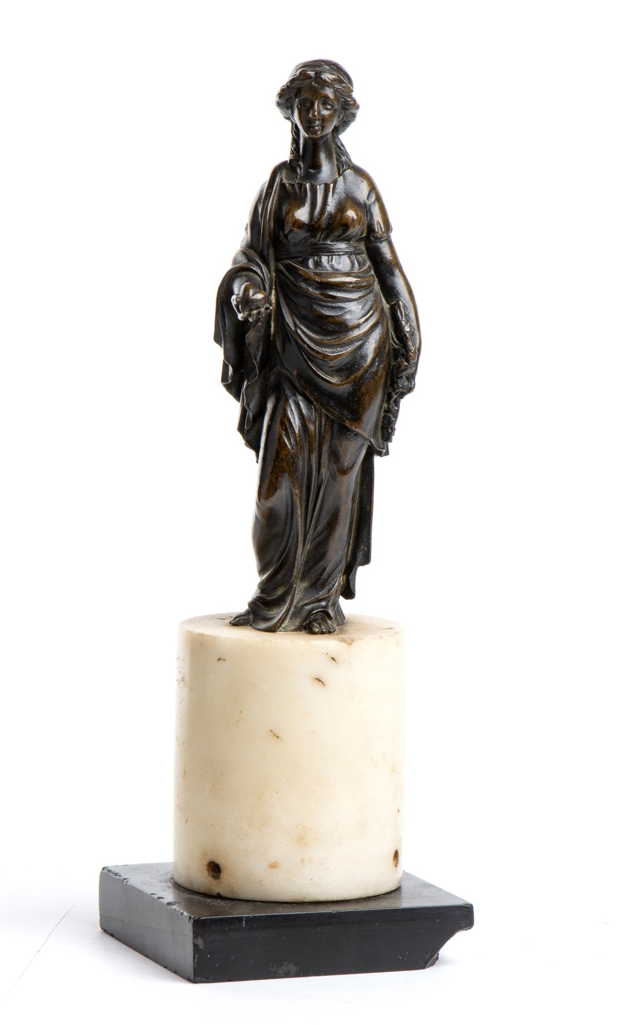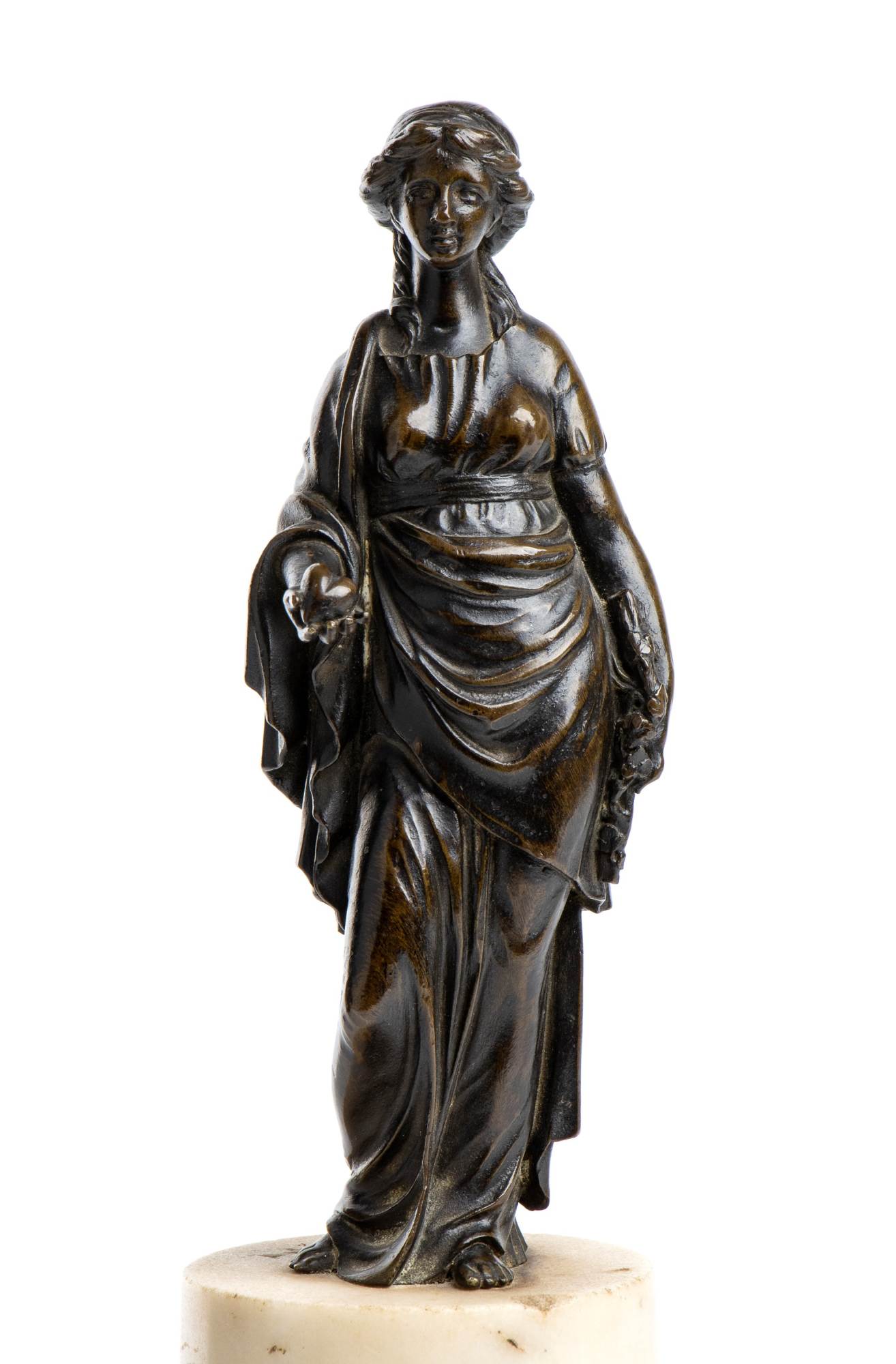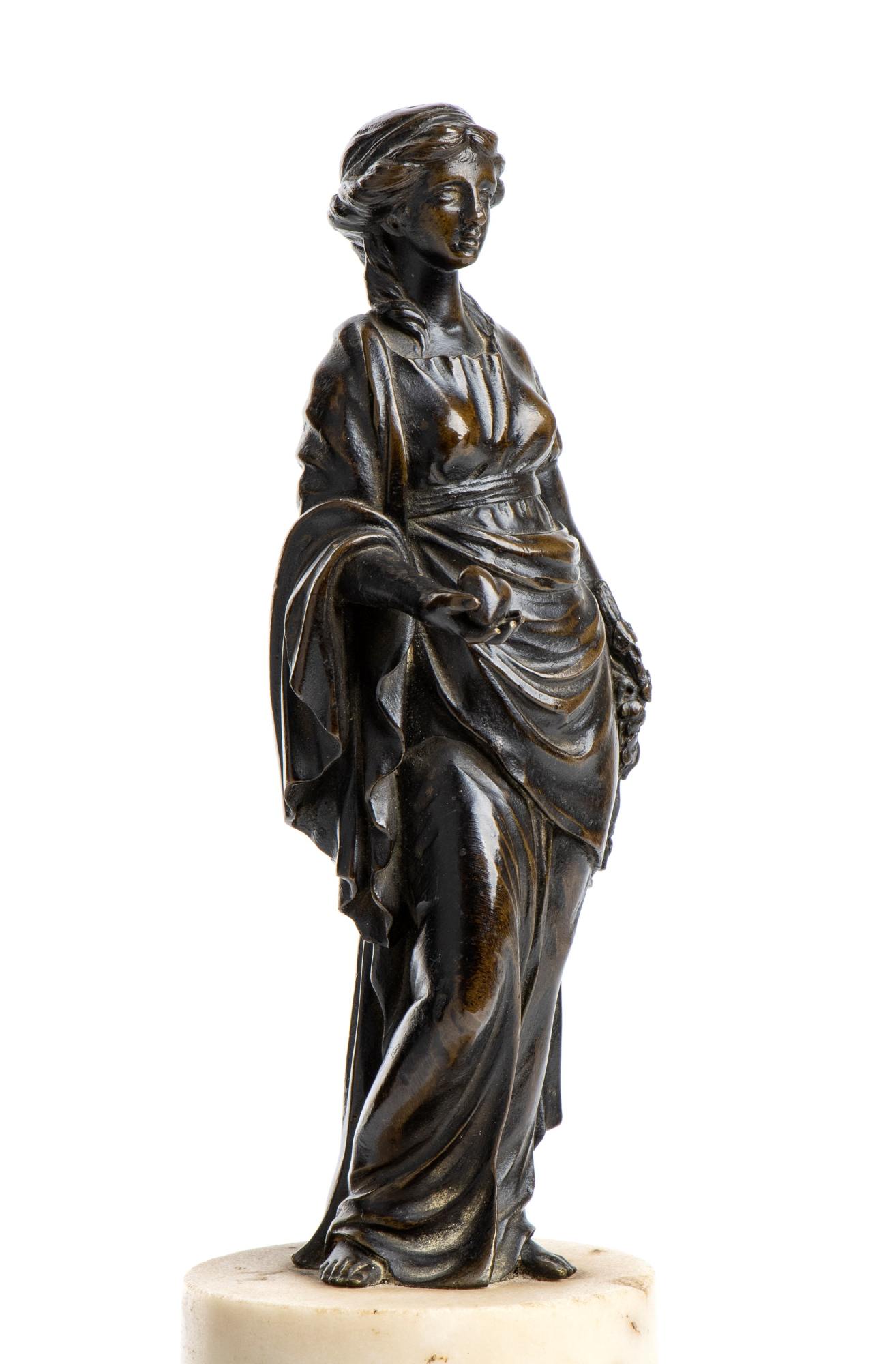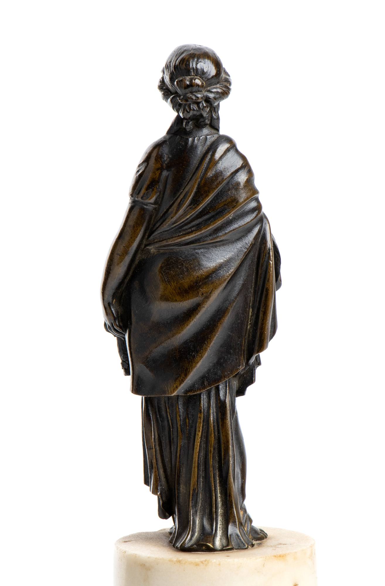 Questo raffinato bronzetto raffigura una donna vestita all'antica, con una lunga veste drappeggiata raccolta sul braccio destro, alla moda delle matrone romane. I capelli sono raccolti con un nastro e ricadono con una ciocca sulla spalla destra.