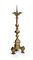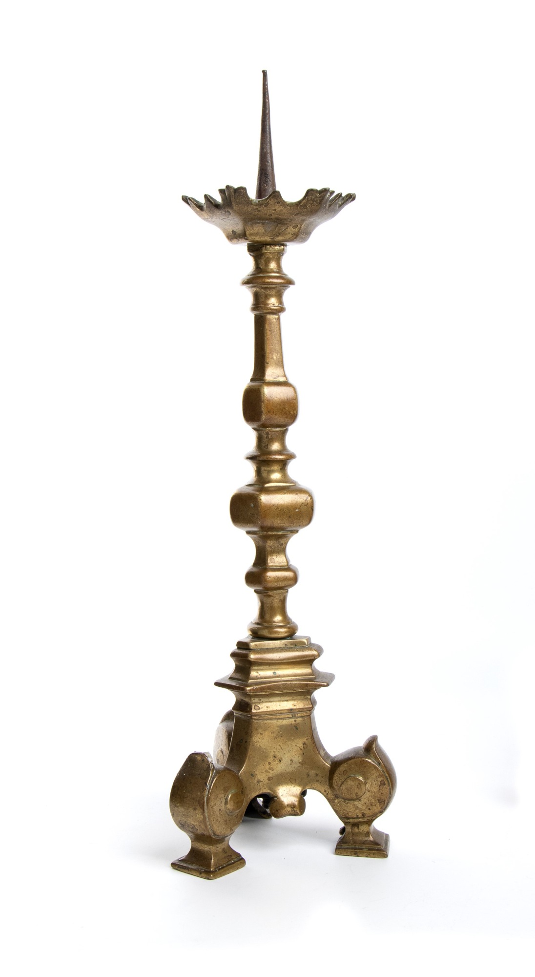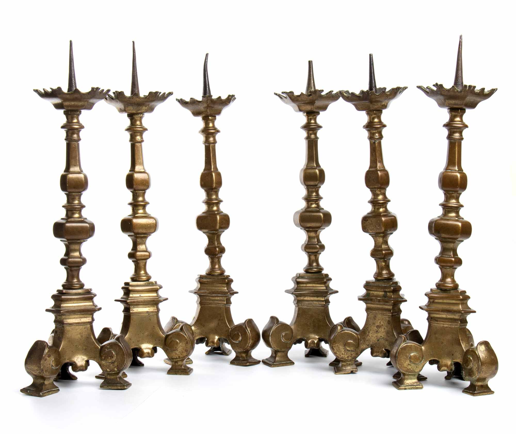 Raro gruppo di candelieri ecclesiastici in bronzo. Splendida tornitura del balaustro con sfaccettature verticali. Il piede si allarga formando una base tripode poggiante su riccioli stilizzati.