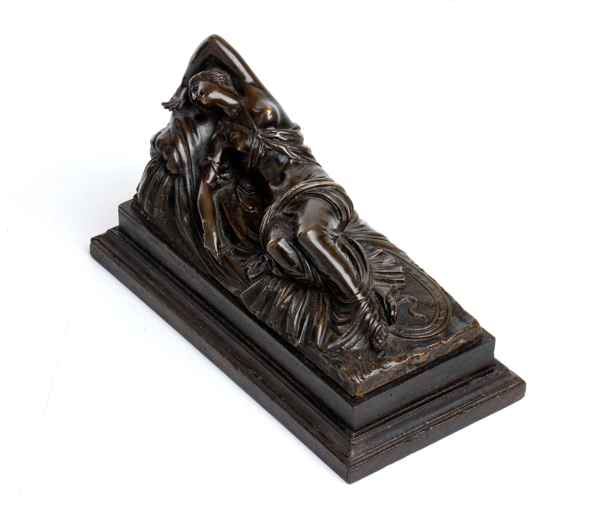 Bronzo, patina dai toni rossastri con fondo più scuro scultura: 11 x 22 x 9 cm base: 5 x 26 x 12 cm
