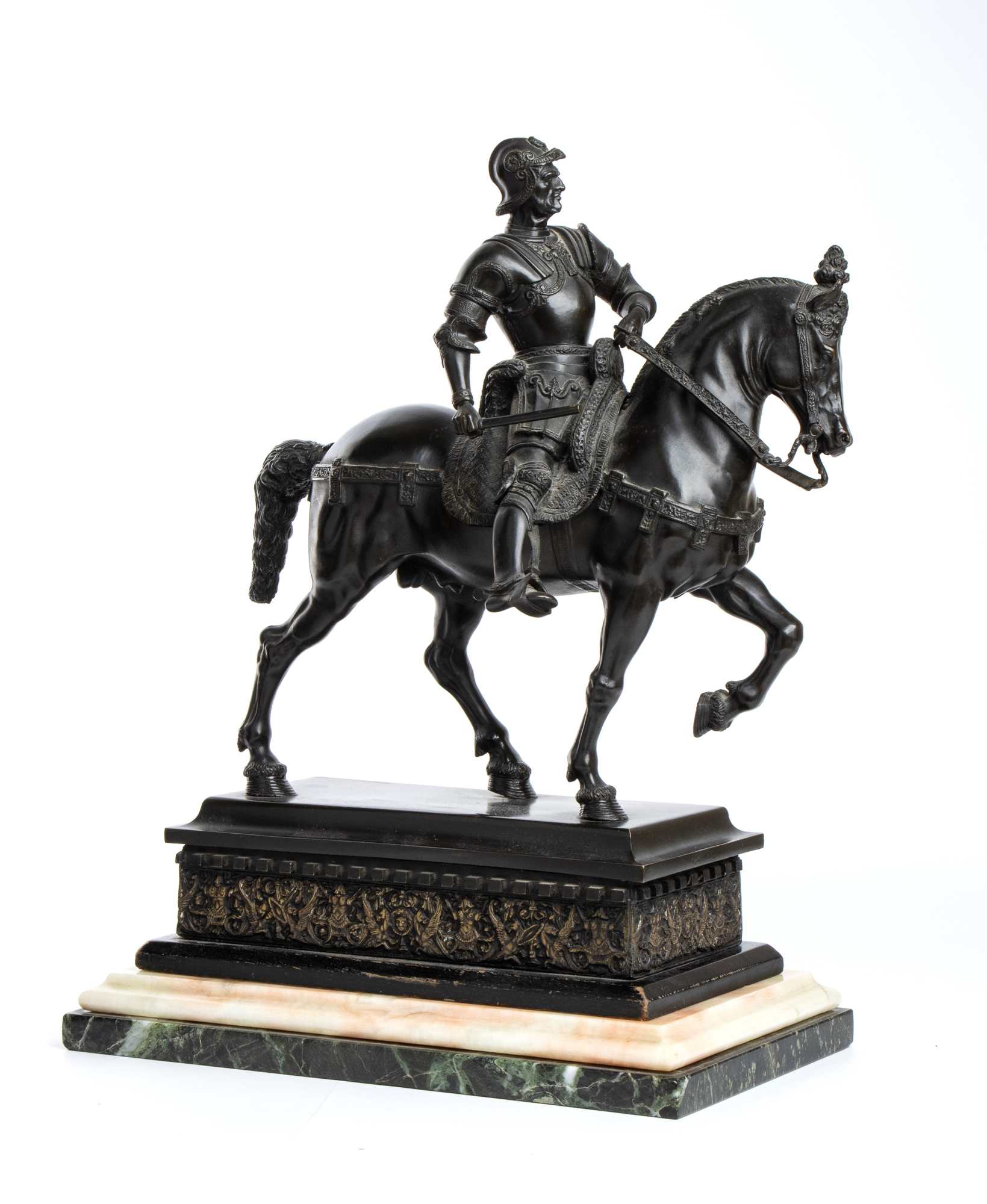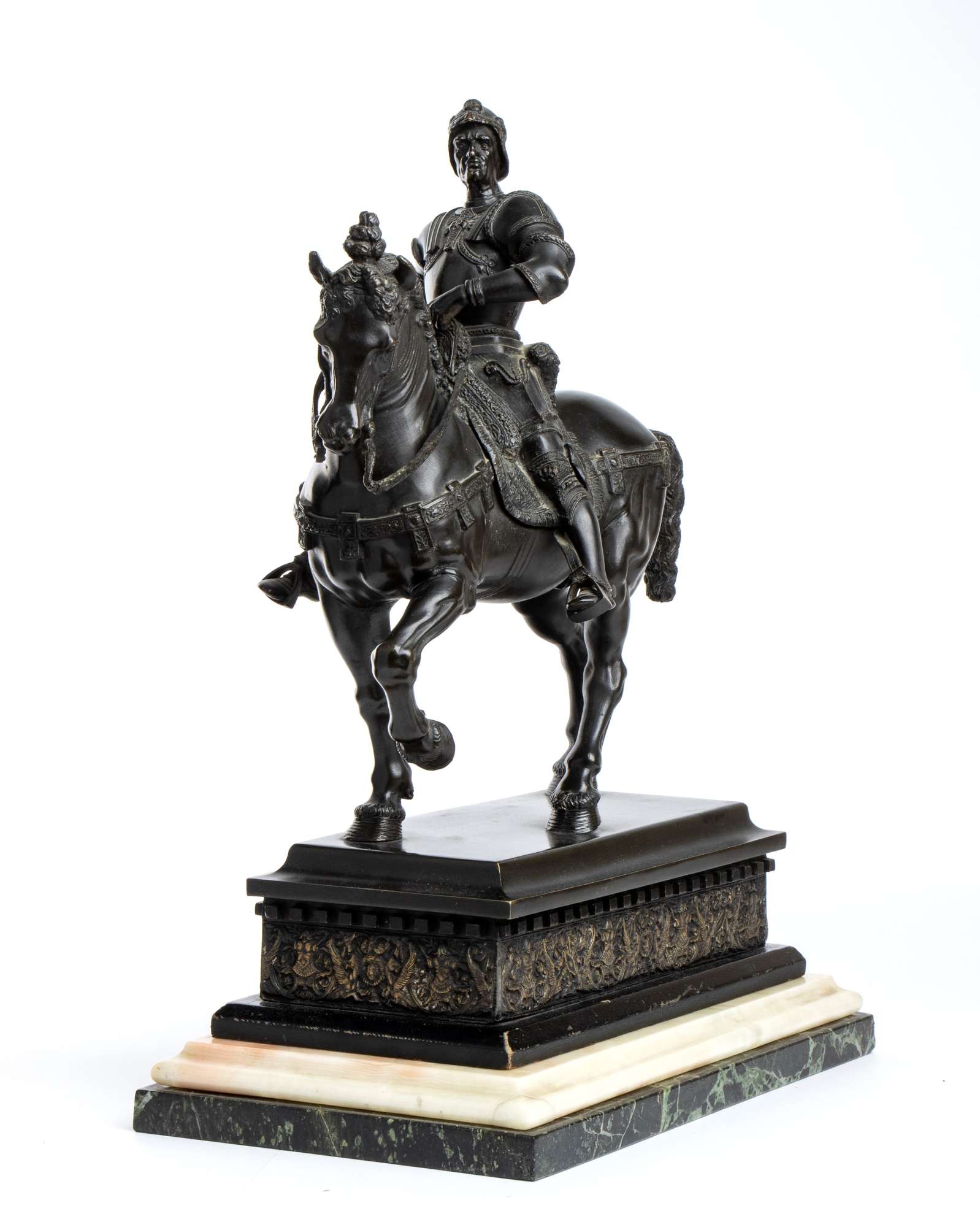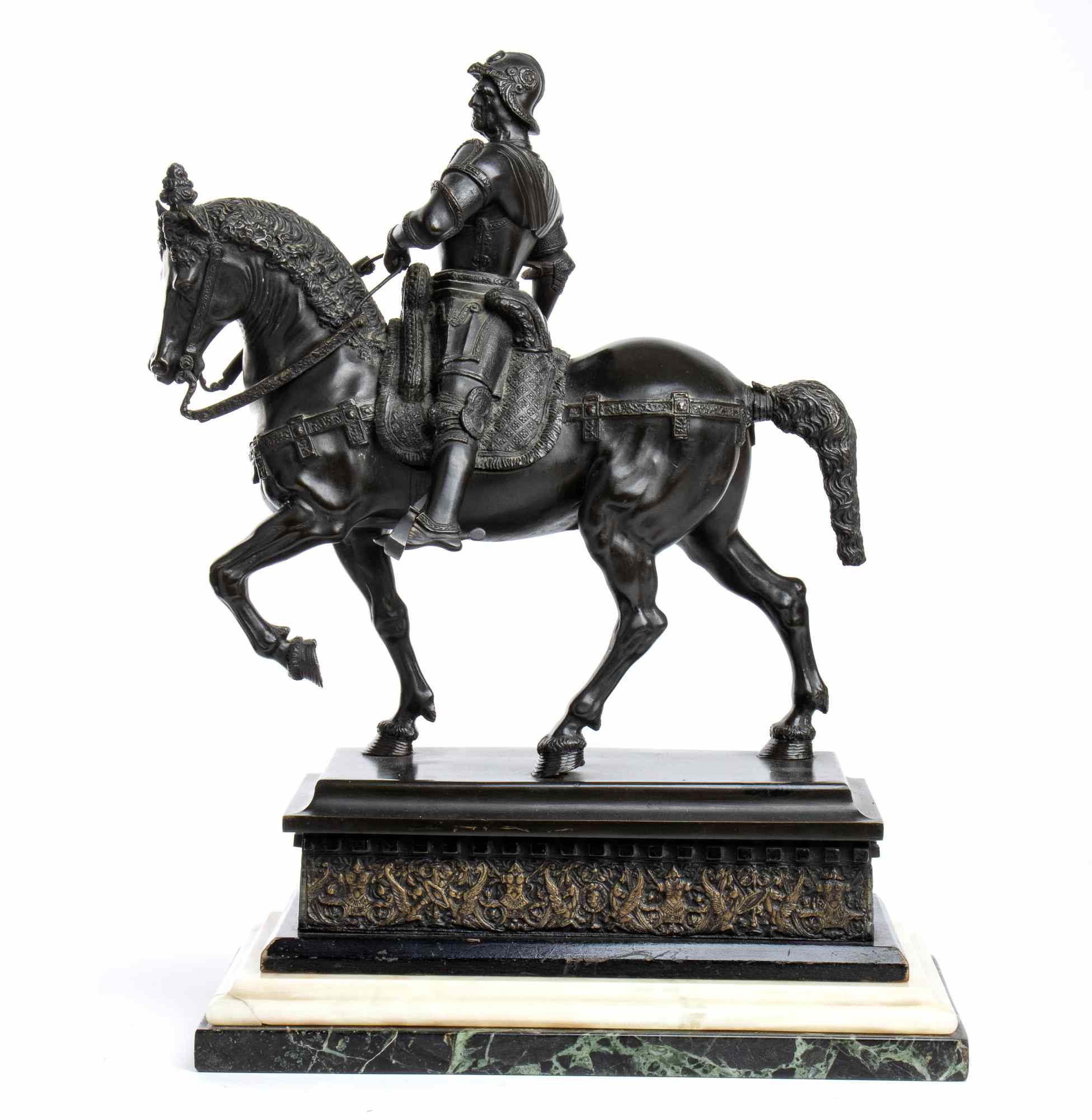 Questo monumento equestre riproduce la notissima scultura dedicata al condottiero Bartolomeo Colleoni collocata a Venezia, in Campo San Zanipolo. Il monumento fu commissionato ad Andrea del Verrocchio e realizzato fra il 1480 e il 1488. Si tratta di uno dei più importanti monumenti equestri del Rinascimento.