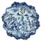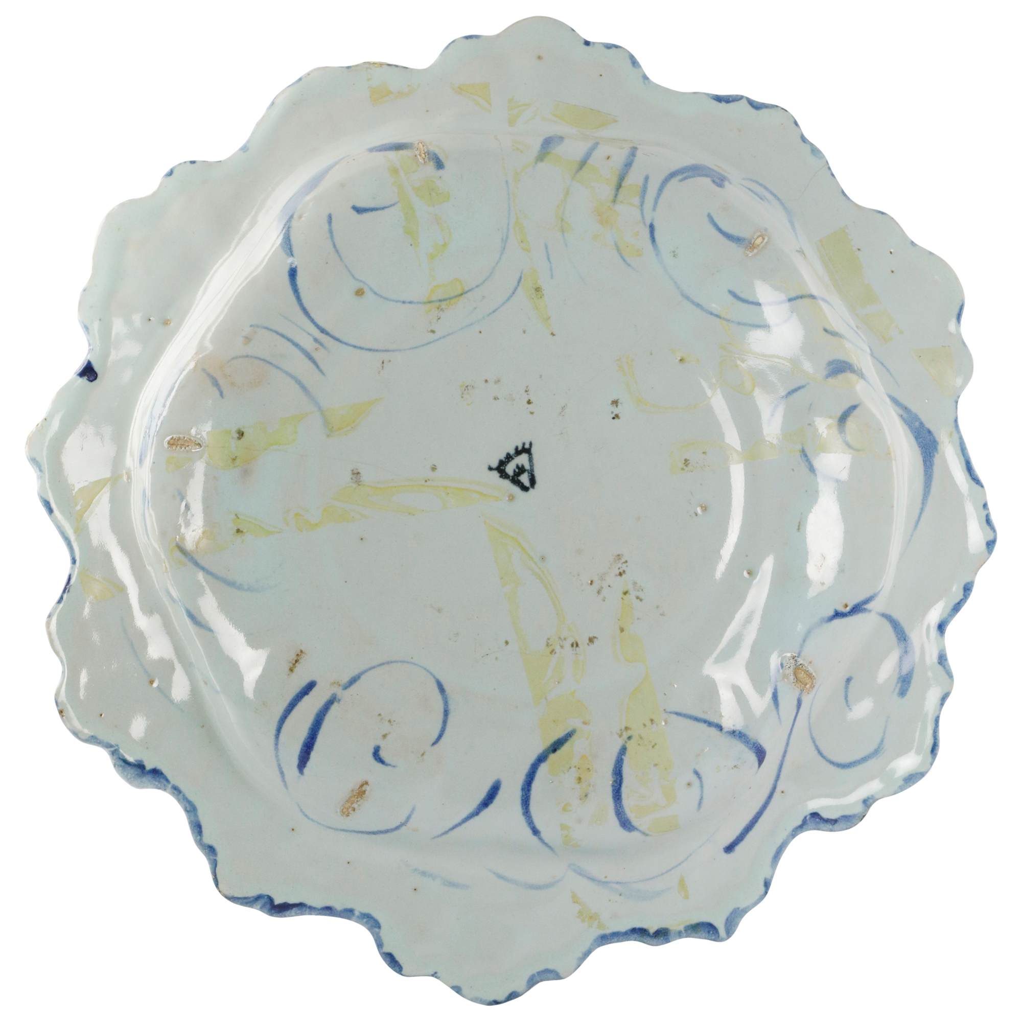 con cavo centrale circondato da un anello appena rilevato a cui segue un ingiro ondulato che termina in una corta tesa a conchiglie. Il verso è liscio, senza anello di appoggio. Bordo a festoni polilobati. Foggiatura a stampo da un modello utilizzato dalle manifatture di Savona ed Albisola dalla metà del XVII secolo.