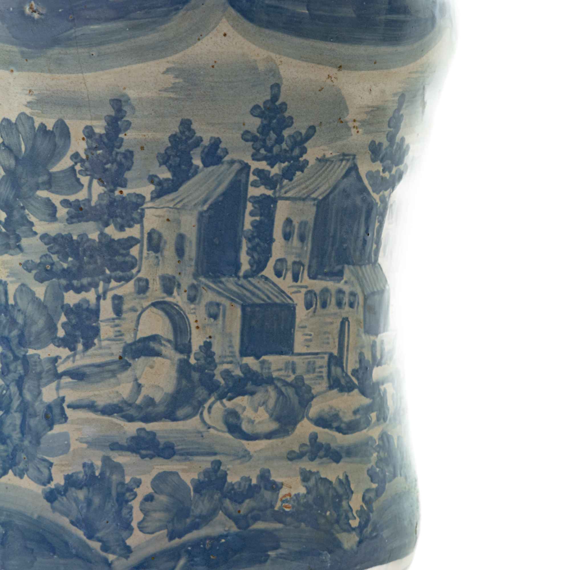Foggiato al tornio di forma a rocchetto con bordo estroflesso. Decoro entro riserva a scorcio di paesaggio con case ed alberi su fondo bianco.