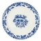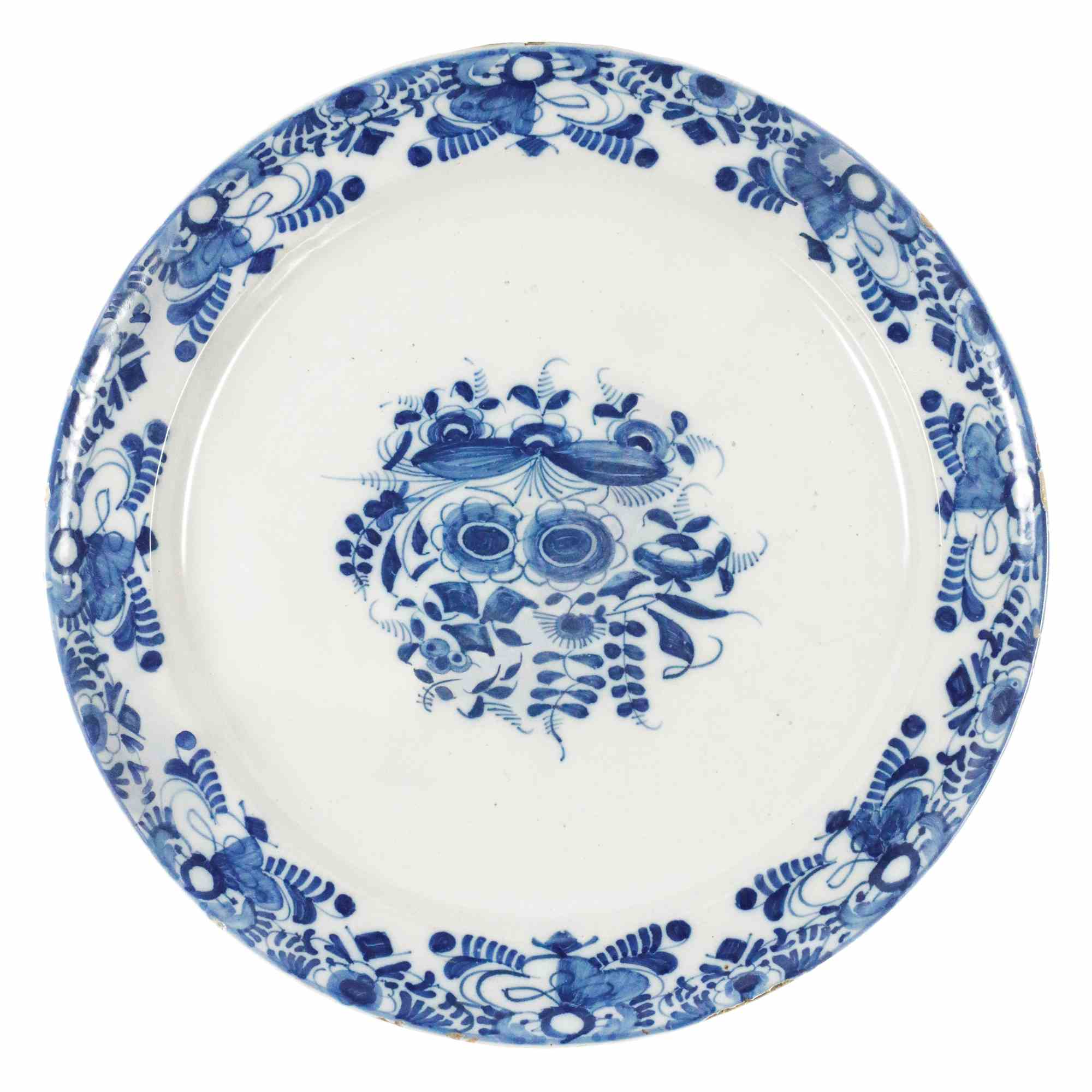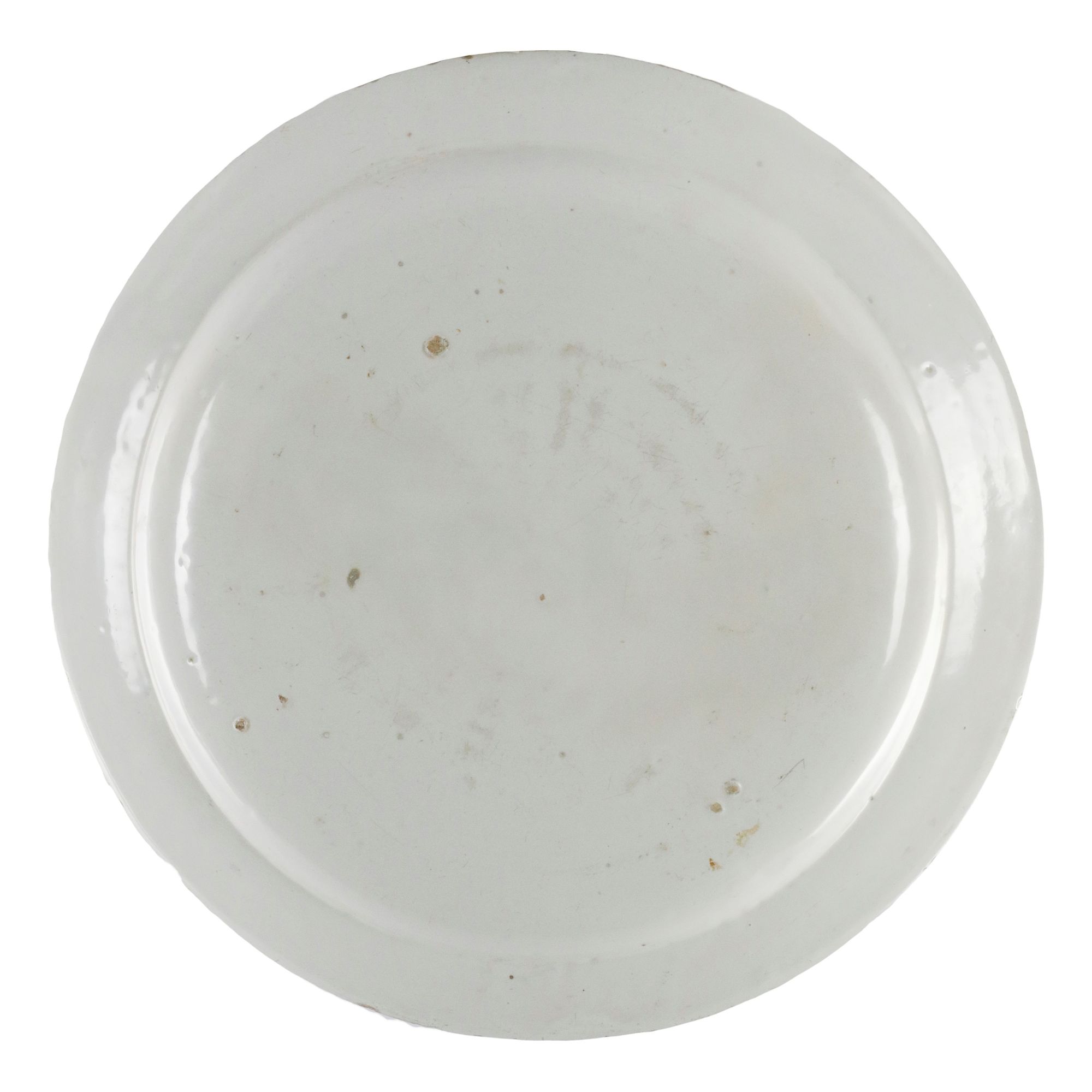Decorazione in monocromia "all'uso di Delft" in blu "zaffera", tradizionalmente denominata "a occhi di bue", caratterizzata da una coppia di fiori sorretti e circondati da foglie, petali e steli. Lungo la tesa, una fascia ornata di fiori e rametti con foglie disposte a pettine. Smalto molto brillante ad elevato contenuto stannico, bianco latte.