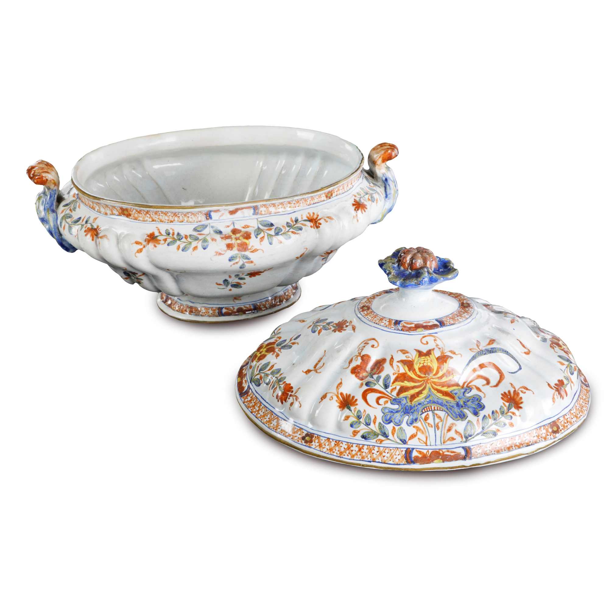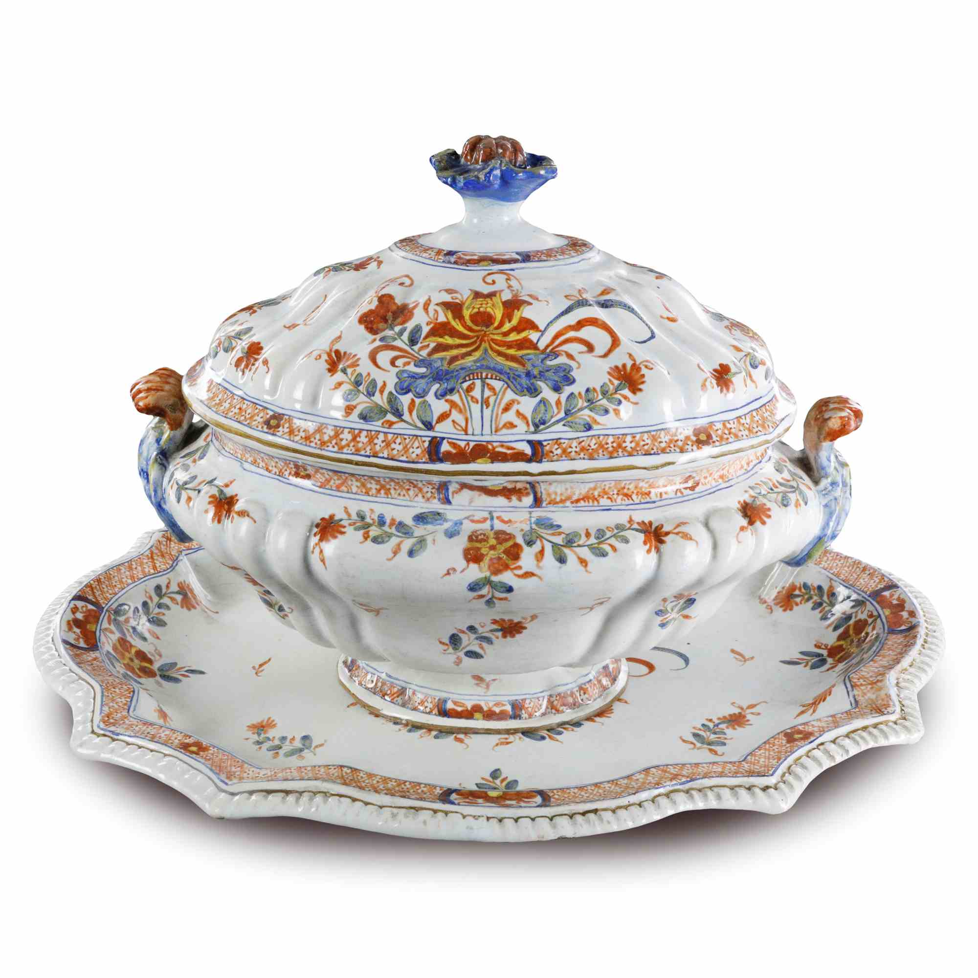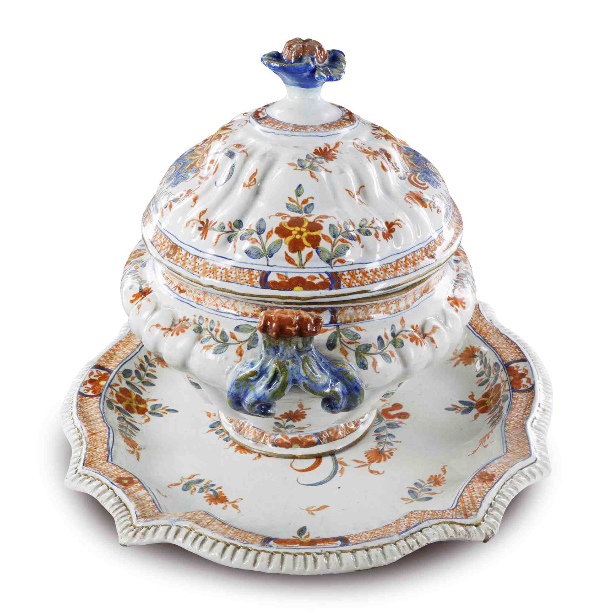 Lotto 101 | Zuppiera con vassoio in ceramica policroma,