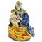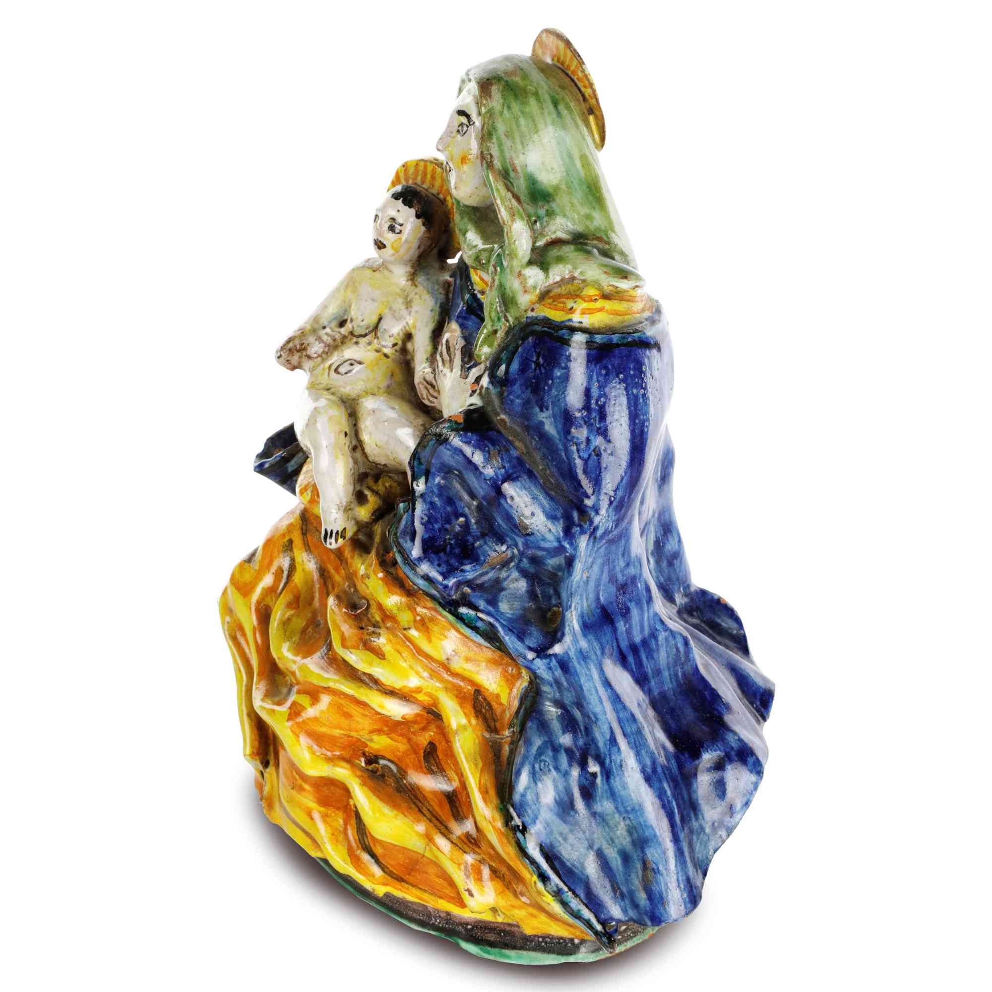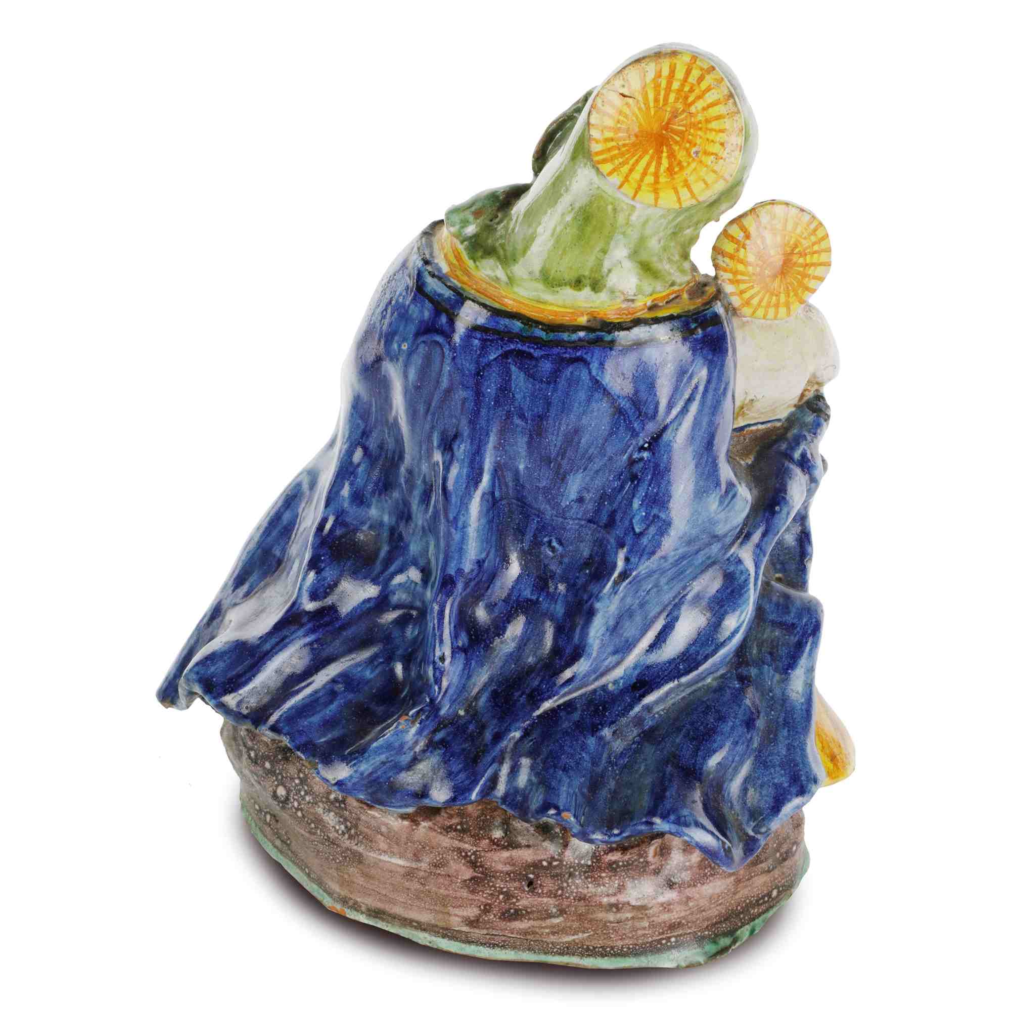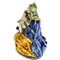 Gruppo in ceramica policroma modellata a mano nelle cromie ocra, verde, blu di manganese e bianco.