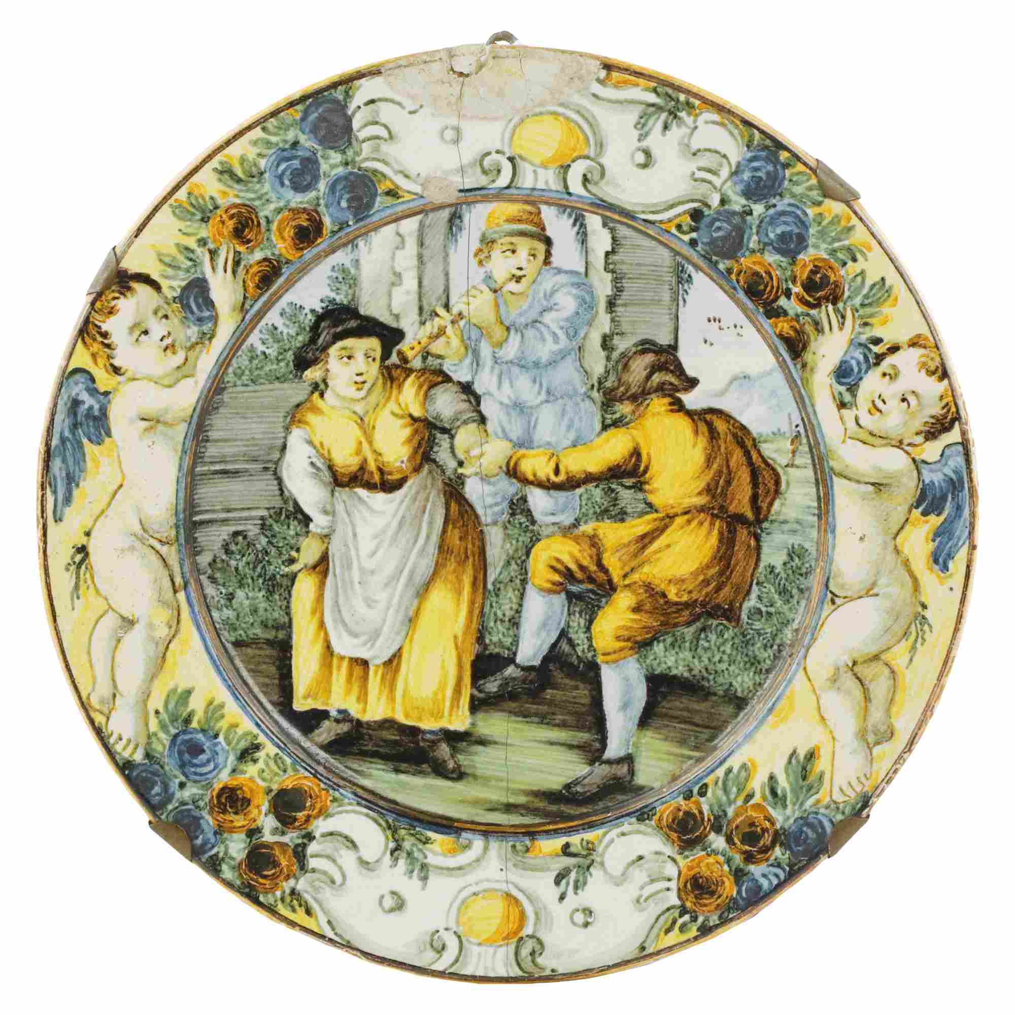 con stretta falda ed ampio fondo, decorato con fiori e putti lungo la tesa e scena di danza nel cavo. Al verso fondo liscio, bottega dei Groue.