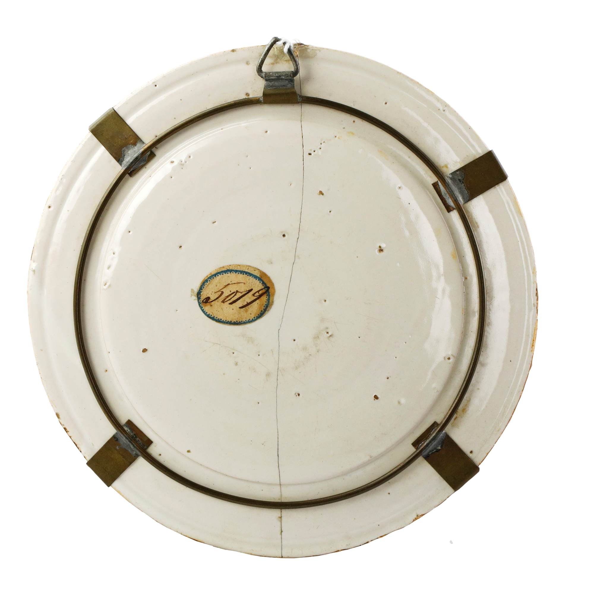 Condizioni: fenditura orizzontale e restauro lungo la tesa.