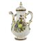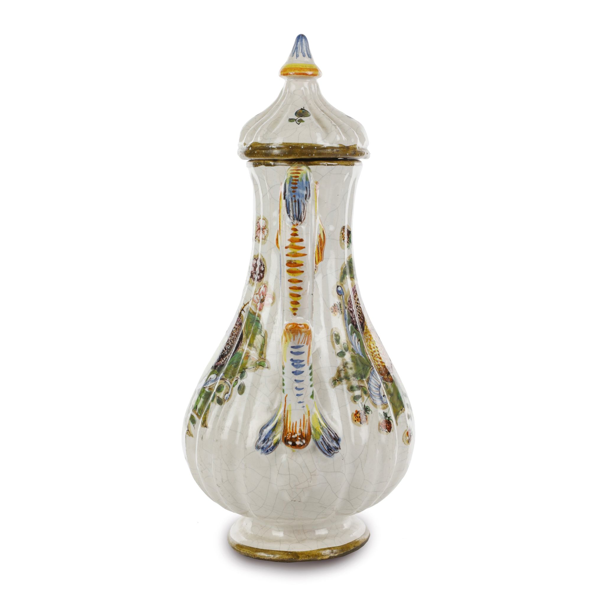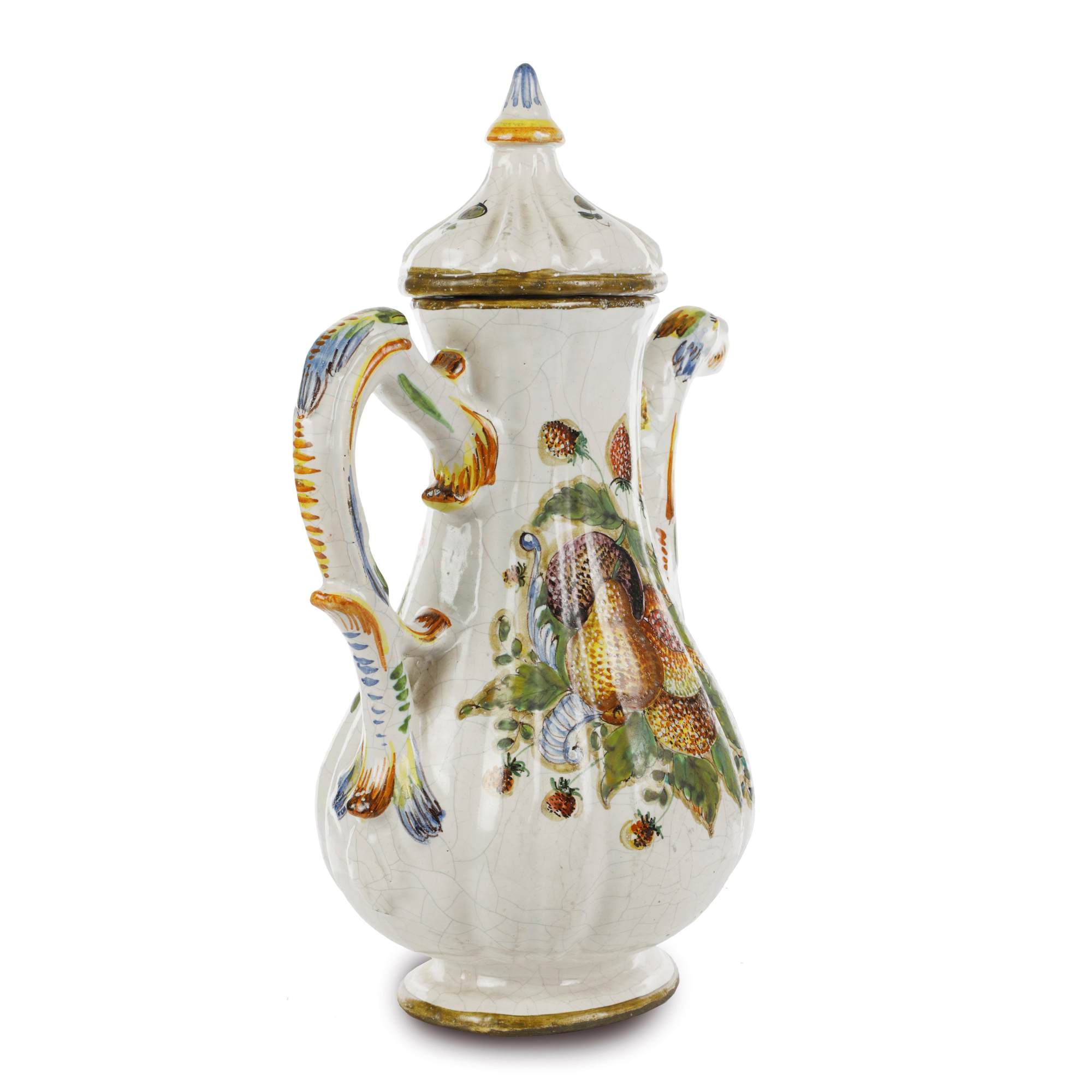 Corpo piriforme costolato e cappello a cuspide, con base terminante ad anello. Presa ad ansa a doppia virgola con versatoio zoomorfo.