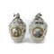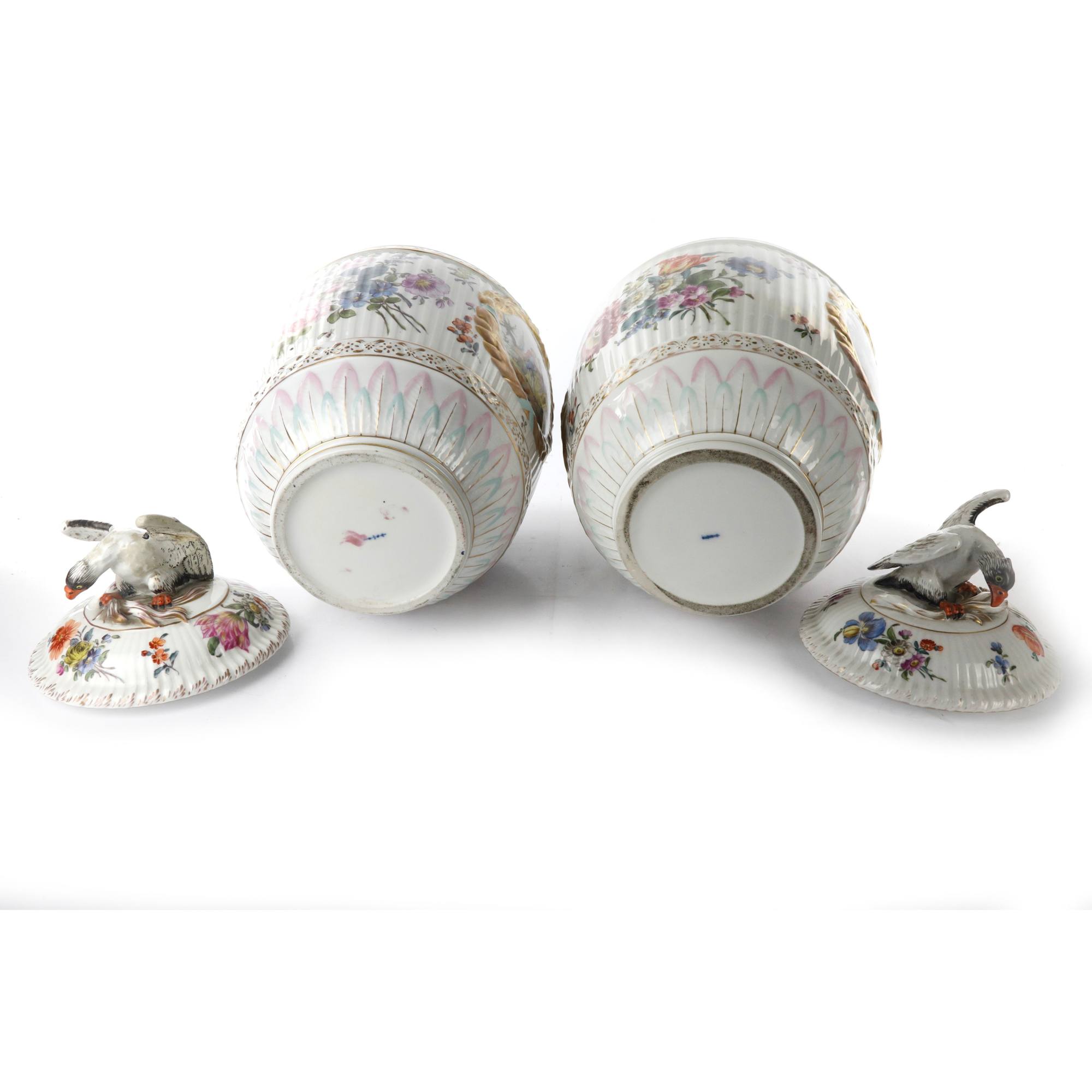 con coperchio ad impugnatura di scultura di rapace. Corpo ovoidale con cinture apicale orizzontale a greca e cintura basale con elementi floreali a rilievo. Base ad anello. Coperchio e corpo del vaso a scanalature verticali; sul corpo coppia di riserve con decorazione floreale con scene cortesi. Finiture in oro zecchino.