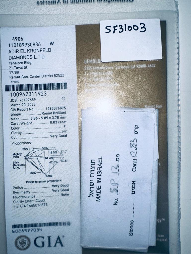 DIAMANTE 0,83 CARATI COLORE F - PUREZZA SI2 - TAGLIO BRILLANTE - CERTIFICATO GIA - PUREZZA SF31003