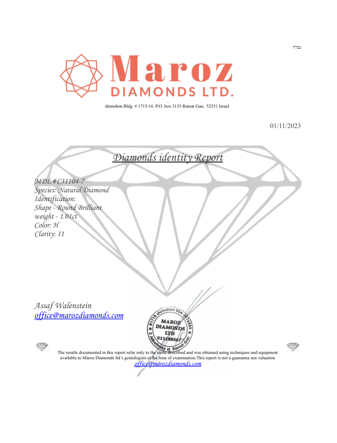 DIAMANTE 1,01 CARATI - COLORE H - PUREZZA I1 - TAGLIO BRILLANTE - CERTIFICATO GEMMOLOGICO MAROZ DIAMONDS LTD MEMBRO ISRAEL DIAMOND EXCHANGE - C31104-7