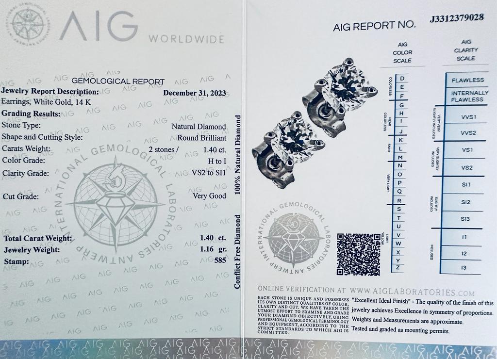 ORECCHINI IN ORO BIANCO 14K 1.16 GR CON DIAMANTI PER 1.40 CARATI COLORE H-I VS2-SI1 CERTIFICATO AIG - ER31204