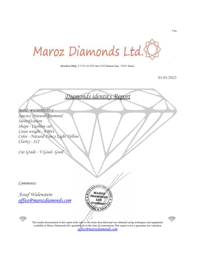 DIAMANTE NATURAL POLISHED 0,9 CARATI NATURAL FANCY GIALLO CHIARO - PUREZZA SI2 - TAGLIO CUSCINO - CERTIFICATO GEMMOLOGICO MAROZ DIAMONDS LTD MEMBRO ISRAEL DIAMOND EXCHANGE - UD30117-1