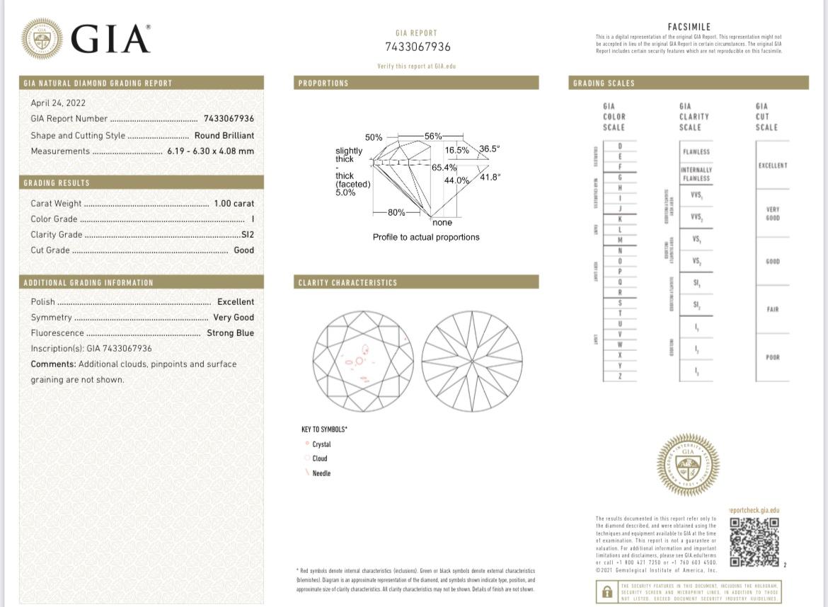DIAMANTE 1 CARATI - COLORE I - PUREZZA SI2 - TAGLIO BRILLANTE - CERTIFICATO GIA - C20612