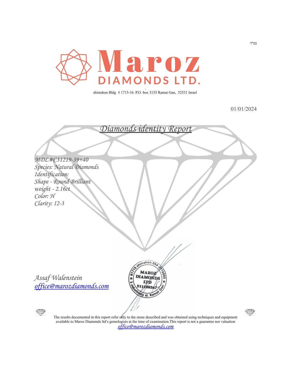 2 DIAMANTI 2,16 CARATI COLORE H - PUREZZA I2-3 - TAGLIO BRILLANTE - CERTIFICATO GEMMOLOGICO MAROZ DIAMONDS LTD MEMBRO ISRAEL DIAMOND EXCHANGE - C31219-39+40