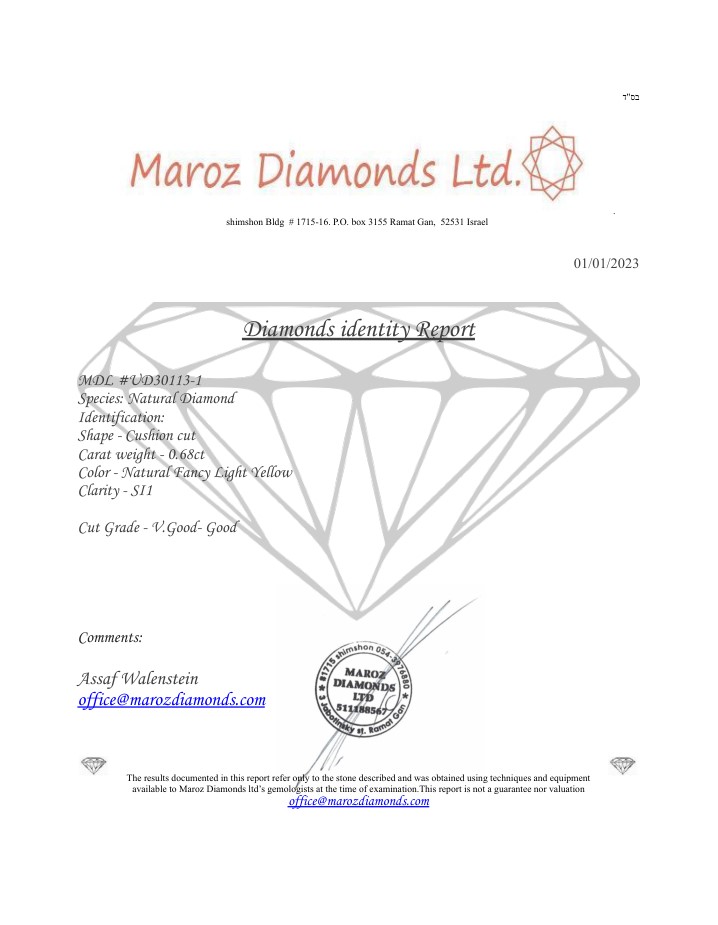 DIAMANTE NATURAL POLISHED 0,68 CARATI NATURAL FANCY GIALLO CHIARO - PUREZZA SI1 - TAGLIO CUSCINO - PUREZZA INCISO AL LASER - CERTIFICATO GEMMOLOGICO MAROZ DIAMONDS LTD MEMBRO ISRAEL DIAMOND EXCHANGE - UD30113-1