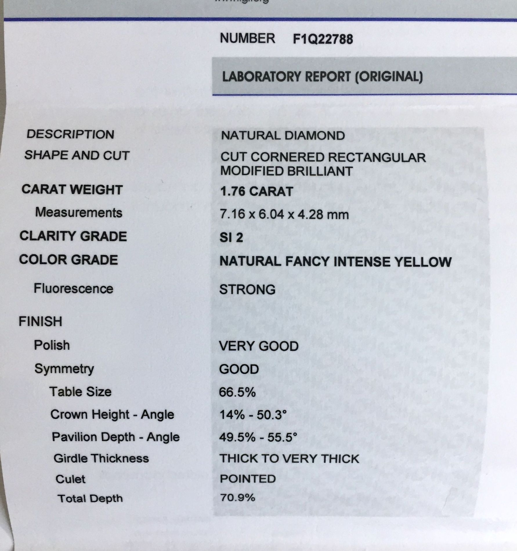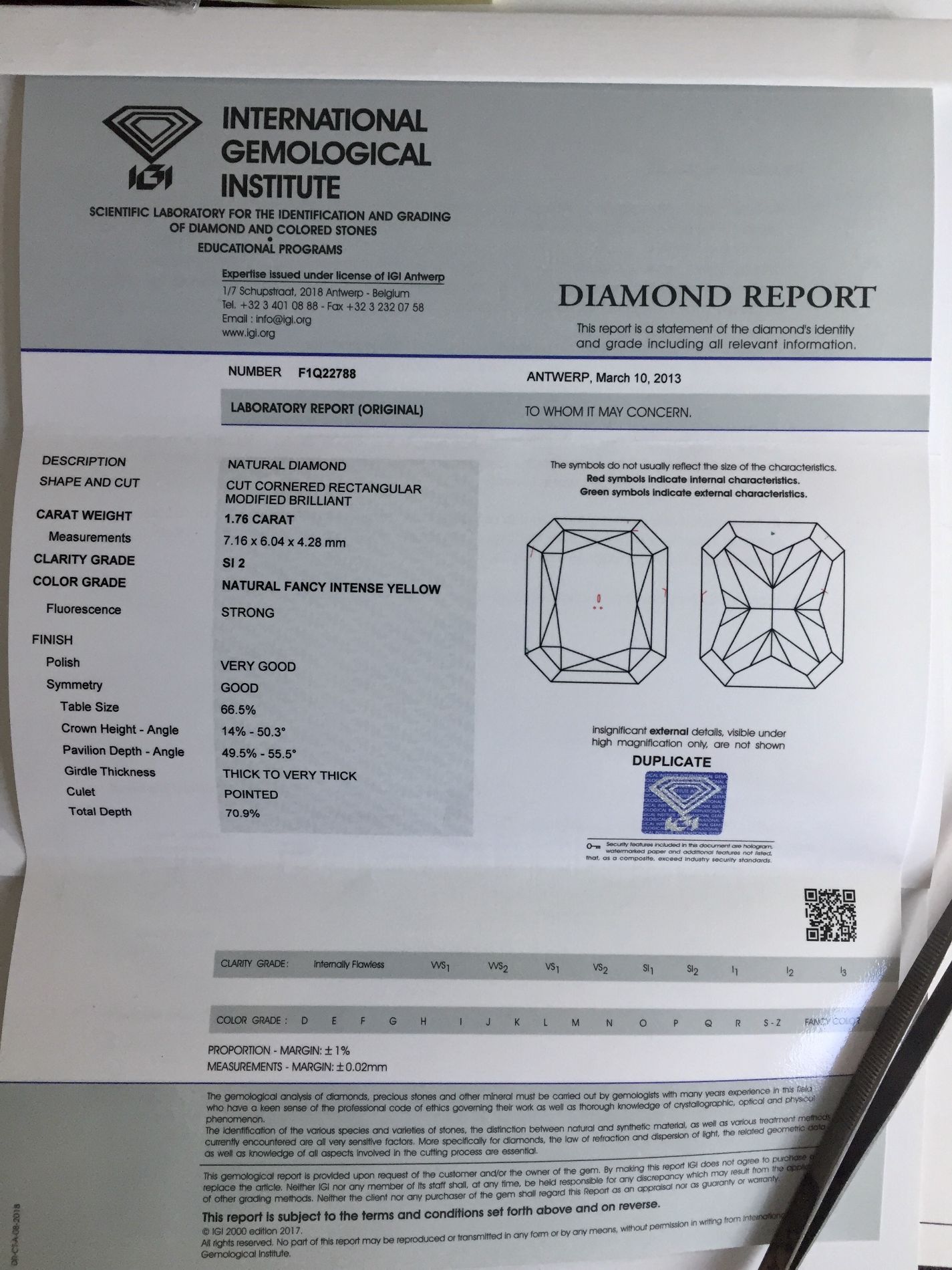 DIAMANTE 1,76 CARATI COLORE NATURAL FANCY GIALLO INTENSO - PUREZZA SI2 - TAGLIO SMERALDO - CERTIFICATO IGI - RM30301