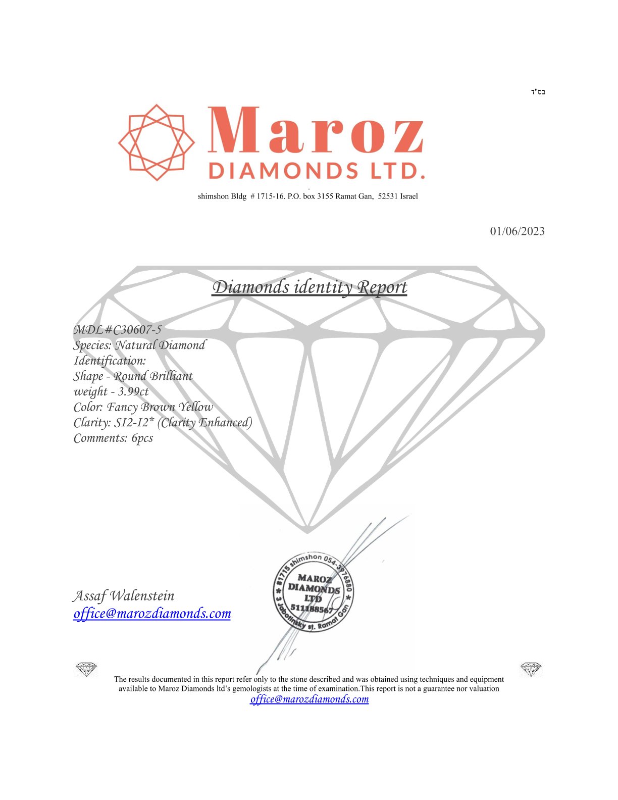 6 DIAMANTI PUREZZA ESALTATA S 3,99 CARATI COLORE FANCY MARRONE GIALLO - PUREZZA SI2-I2* - TAGLIO BRILLANTE - CERTIFICATO GEMMOLOGICO MAROZ DIAMONDS LTD MEMBRO ISRAEL DIAMOND EXCHANGE - C30607-5