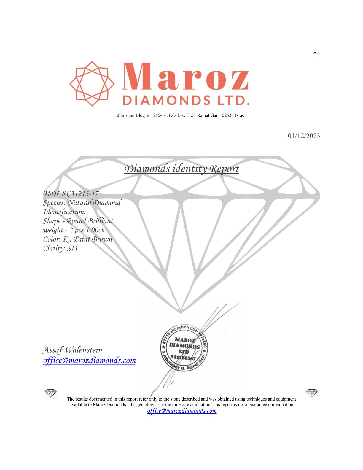 2 DIAMANTI 1 CT COLORE K - PUREZZA SI1 - TAGLIO BRILLANTE - CERTIFICATO GEMMOLOGICO MAROZ DIAMONDS LTD MEMBRO ISRAEL DIAMOND EXCHANGE - C31213-17