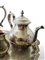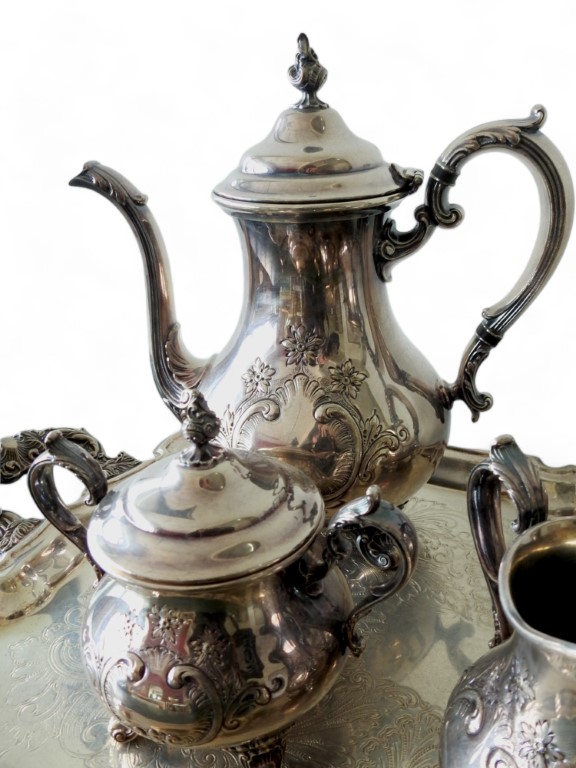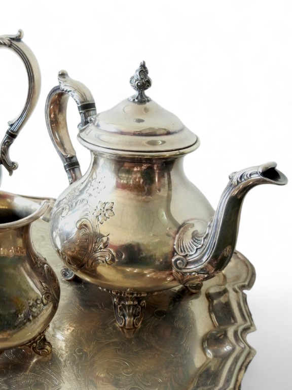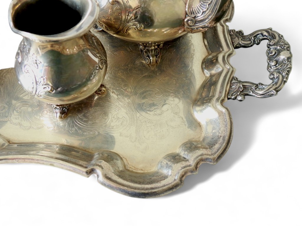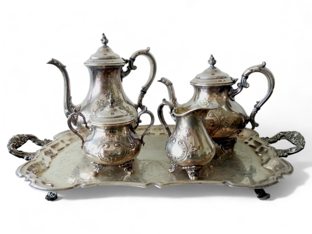 in metallo argentato e cesellato a motivi vegetali composto da caffettiera, teiera, zuccheriera e lattiera, completo di vassoio sagomato e cesellato, di altra manifattura.