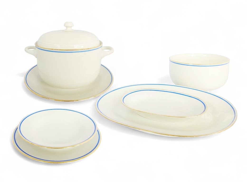 Realizzato con rigo blu e oro sul bordo, composto da dodici piatti piani, dodici scodelle, dodici piatti frutta, due vassoi, un piattino da burro, una zuppiera e un'insalatiera