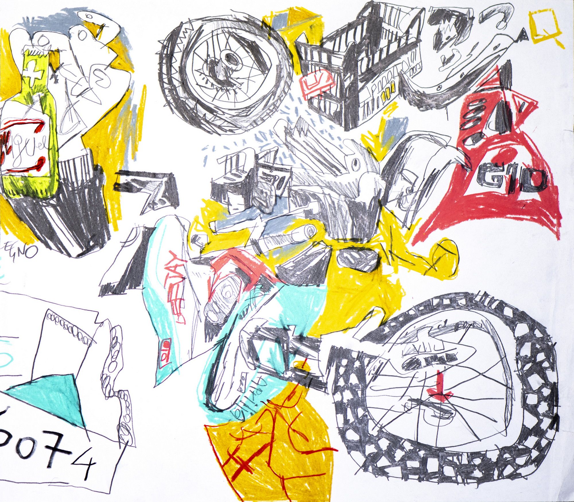 MARTOZ "Discarica abusiva". inchiostro su carta da spolvero con acrilico bianco. Cm 30,00 x 34,00. Si presenta come un foglio A3 ma ritagliato, dunque un formato inusuale. Proprio per esprimere ulteriore concetto di scarto. Così ce lo descrive lo stesso artista con le sue parole che riportiamo: "...moto in discarica: durante una gita a caccia di luoghi abbandonati nelle Marche, ho trovato i resti di una moto divelta in mezzo a dei rifiuti. formato inusuale, A3 ritagliato. per via dello stile astratto e dei pastelli a cera, uno dei miei pezzi preferiti".