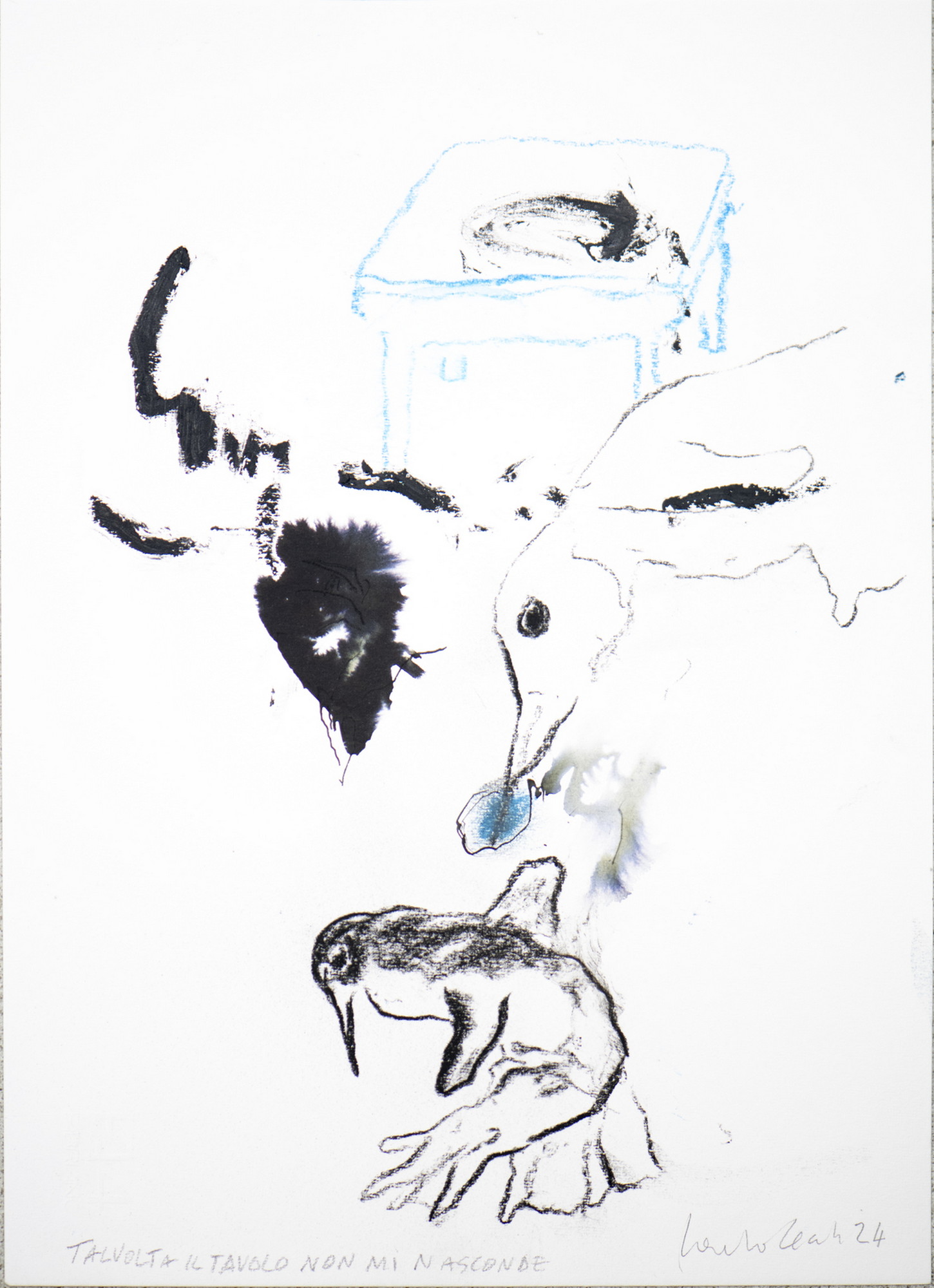 Rimbalza da tempo immemorabile il pinguino di Carlo Cecchi nei suoi disegni, quasi ormai gabbiano alla Hugo Pratt, ma mai prima d’ora aveva espresso simili pensieri e concetti come in queste tavole a tecnica mista.
