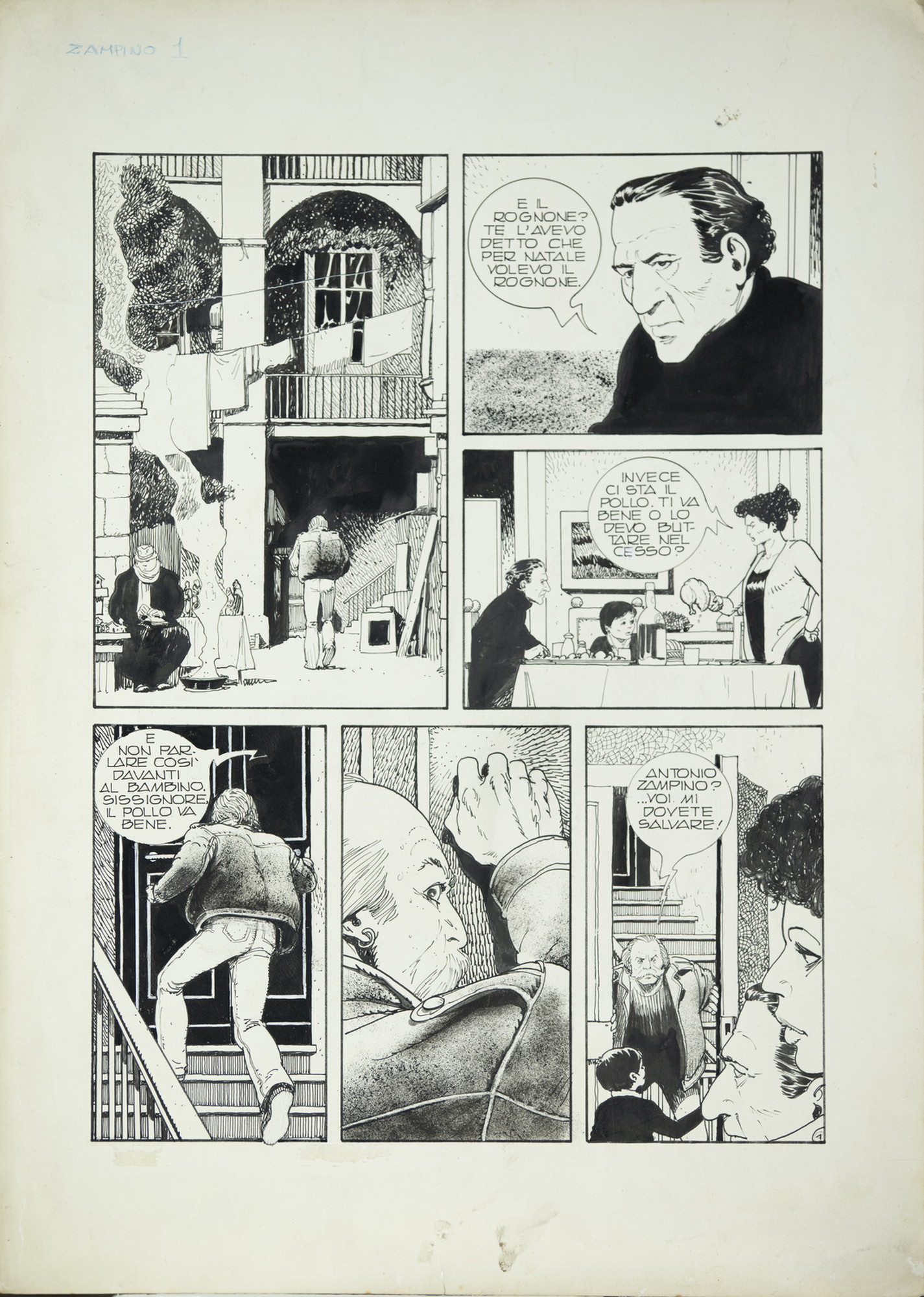 Cossu Ugolino Antonio Zampino: Episodio Siccome era Natale. 1983. China su carta. Cm 30,00 x 50,00. Prima tavola dell'episodio Siccome era Natale con il personaggio di Antonio Zampino, il faccendiere triste, uscito sul n 13 Orient Express nell'agosto del 1983 dalla penna graffiante di Giuseppe Ferrandino. Difetti lievi