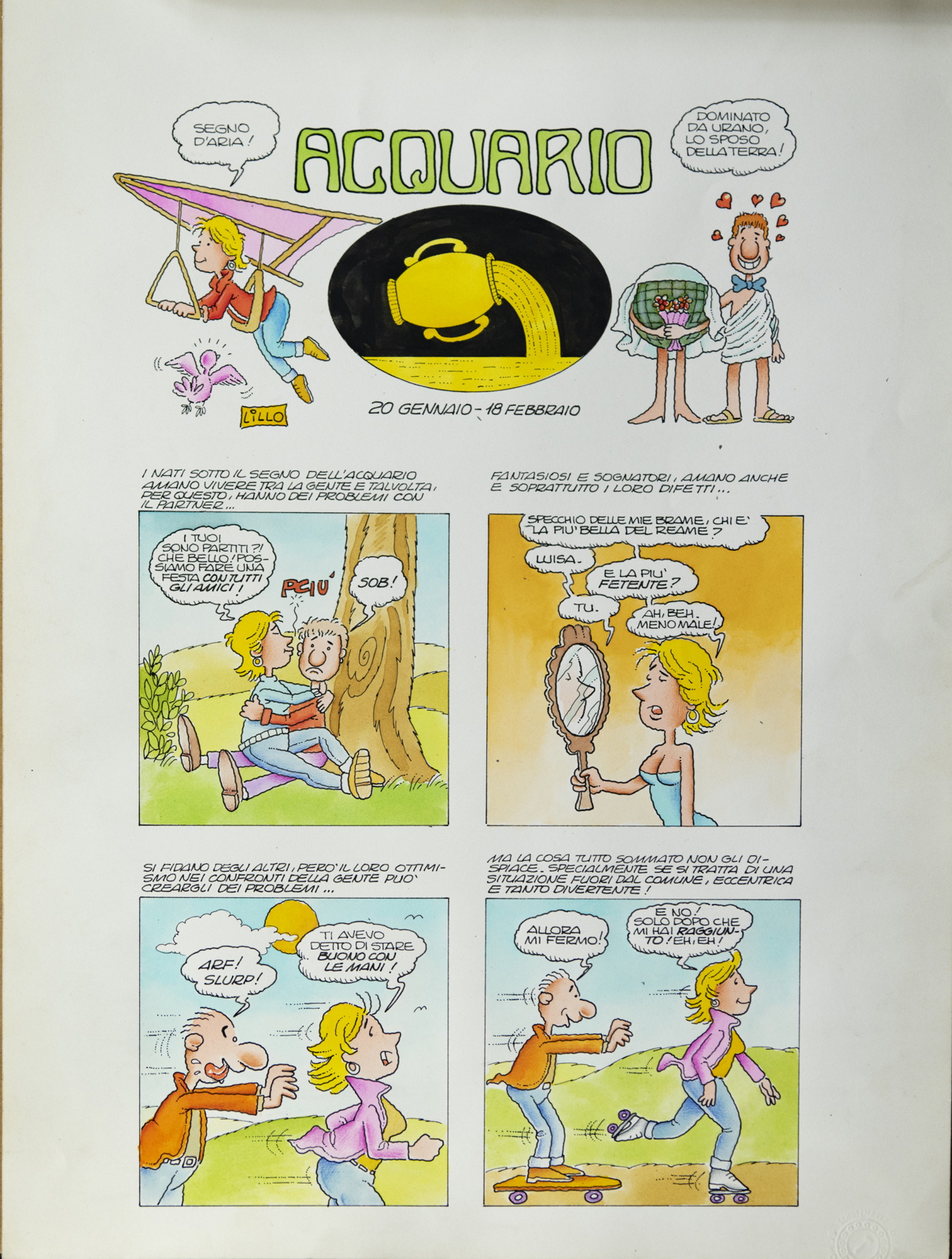 LILLO La serie dei segni zodiacali. 1999. Chine colorate su Cartoncino Schoeller. Cm 36,00 x 25,00. Tavola sul segno zodiacale dell'Acquario con velina trasparente di protezione.
