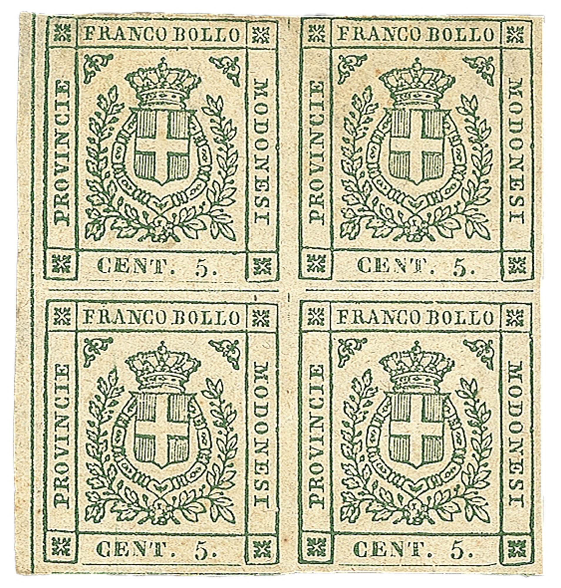 Antichi Stati Italiani - Modena - 1859 - Quartina del 5 cent (12 cat.11000)Quartina del 5 cent verde (12 cat.11000) - nuova con gomma originale nella coppia superiore e integra in quella inferiore