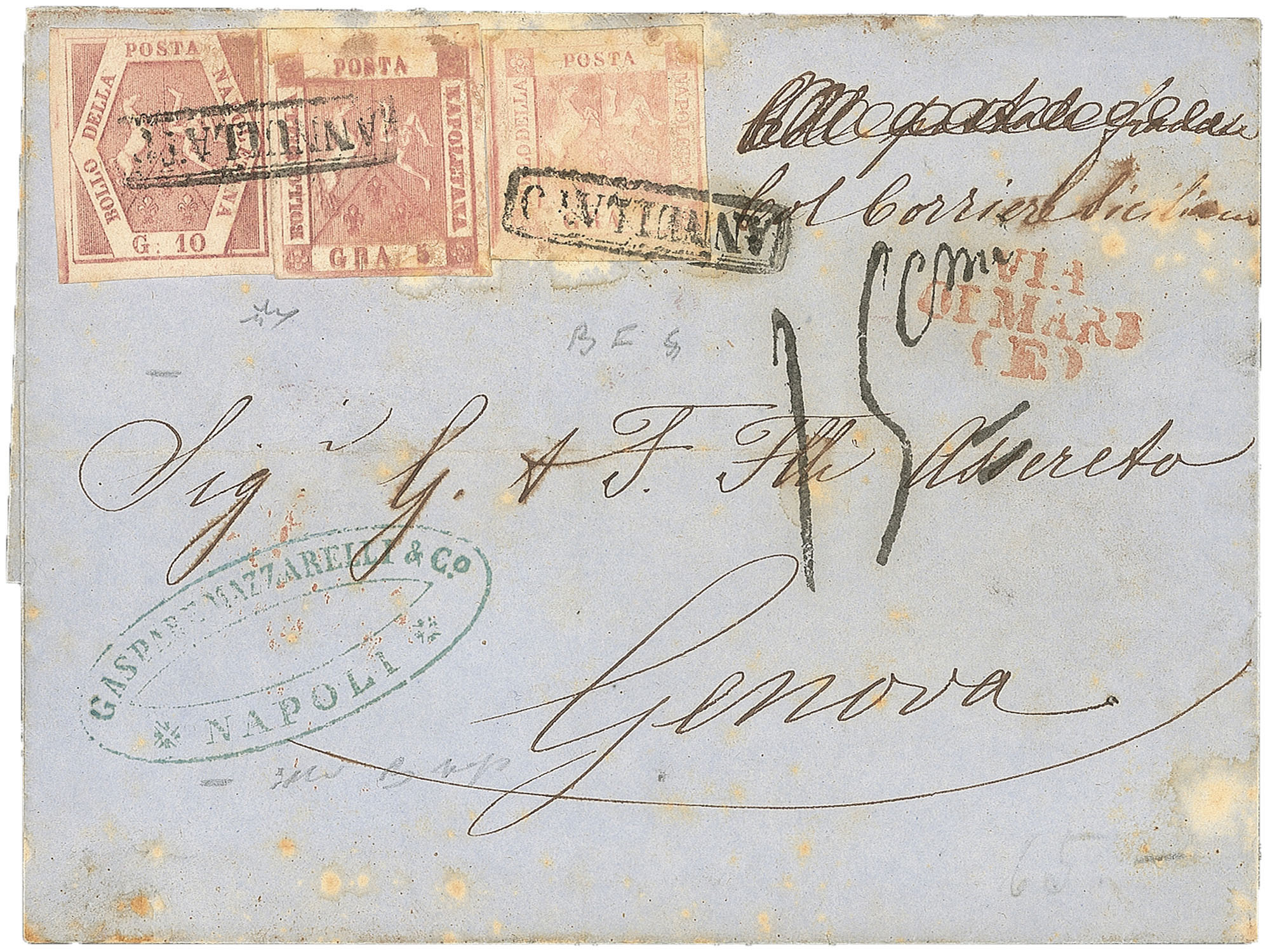 Antichi Stati Italiani - Napoli - Lettera (3 + 8 + 10)Lettera con affrancatura tricolore composta da 1 grano rosa chiaro + 5 grana rosa brunastro con doppia incisione completa + 10 grana rosa brunastro (3 + 8 + 10) da Napoli 12 MAR.58 con a lato il bollo rosso su tre righe 'Via di Mare (E)' diretta a Genova e tassata a tampone 15 centesimi - firma Chiavarello