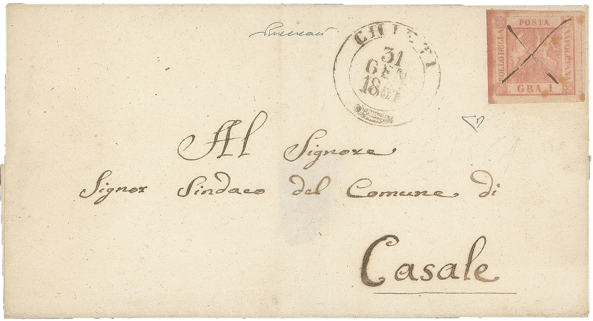 Antichi Stati Italiani - Napoli - Lettera (3b)Lettera da CHIETI 31 GEN. 1858 a Casale (ora Casaleincontrada) affrancata in tariffa per il circondario con 1 gr. rosa 1a Tavola (3b) annullato a penna - cert. ED
