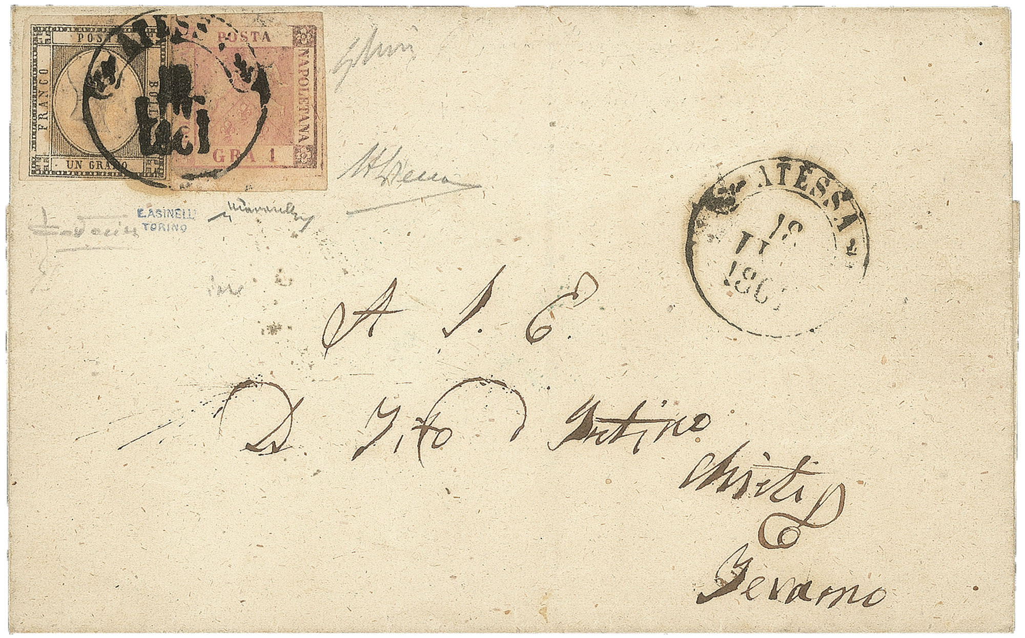 Antichi Stati Italiani - Napoli - Lettera con affrancatura mistaLettera con affrancatura mista di valori gemelli Regno 1 grano prima tavola + Province Napoletane 1 grana da Atessa 18 LUG.1861 per Teramo - cert. A.Diena