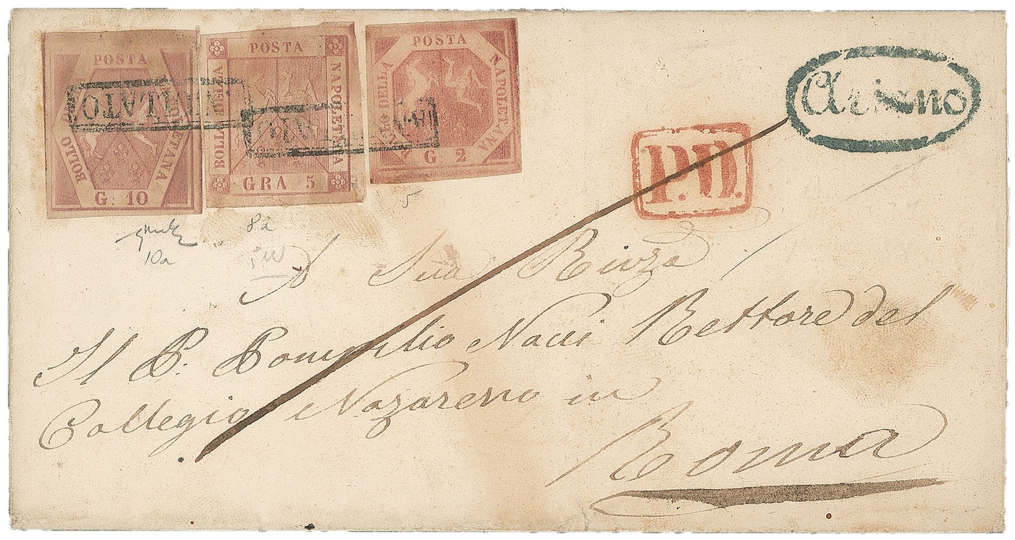 Antichi Stati Italiani - Napoli - Busta con 2+5+10 grana (5+8+10a)Busta affrancata con 2+5+10 grana (5+8+10a) da Ariano a Roma del 15.11.58 - pagata a destino - Chiavarello