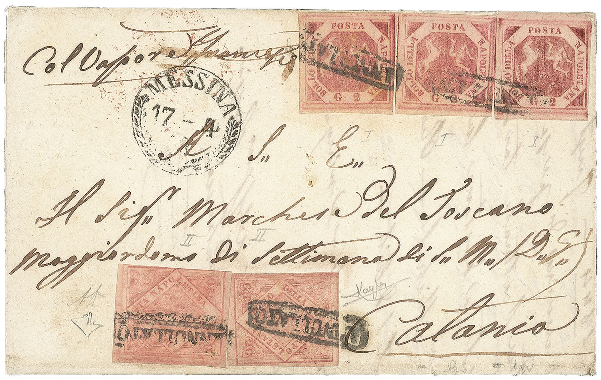 Antichi Stati Italiani - Napoli - Lettera (5f + 13a cat.27000+)Lettera da Napoli 19 APR.1860 viaggiata coi vapori per Catania affrancata per 46 grana co tre esemplari del 2 grana carminio vivo I tavola + due esemplari del 20 grana rosa carminio chiaro II tavola (5f + 13a cat.27000+) - firma AD + cert. Enzo Diena