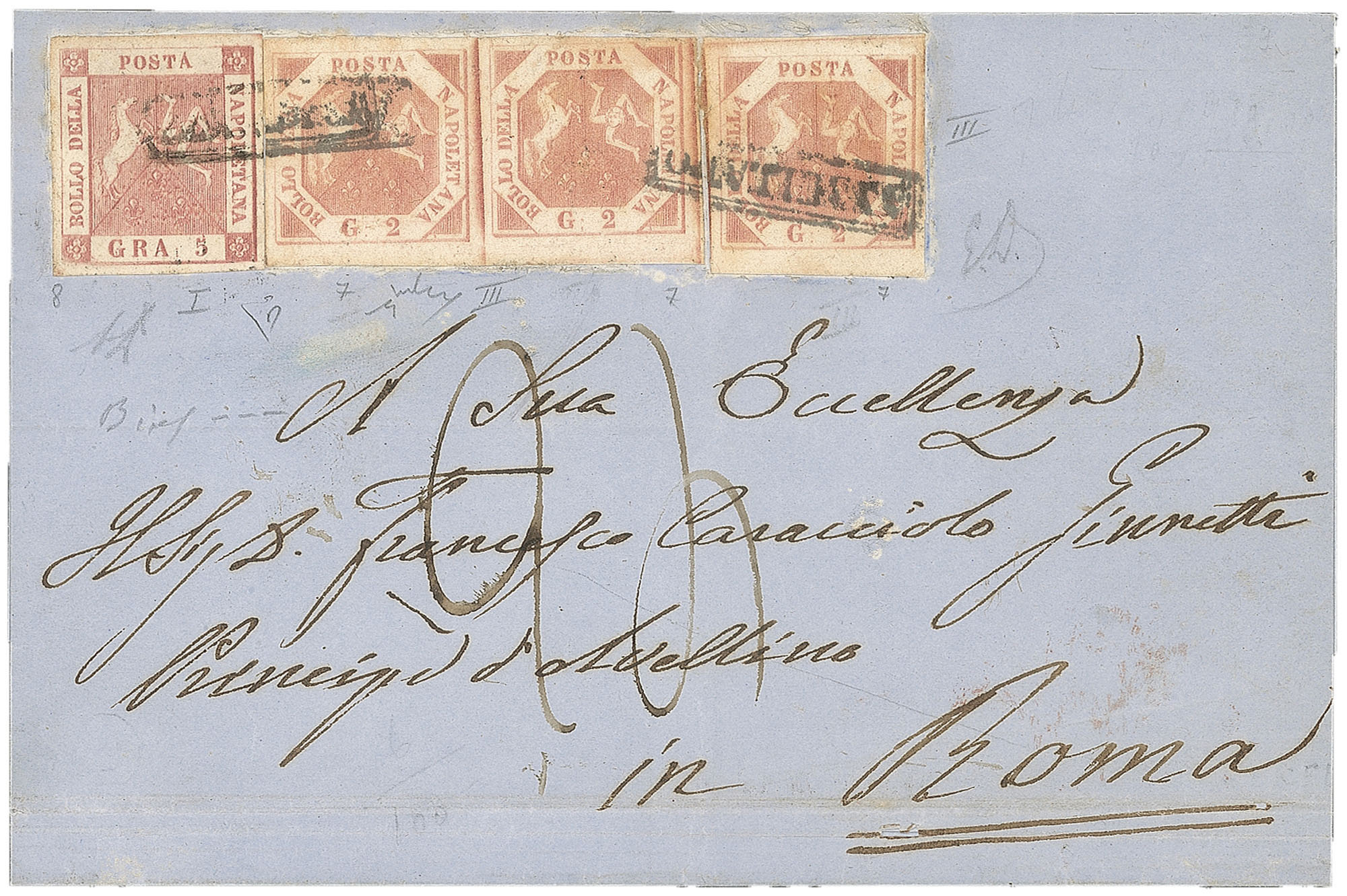 Antichi Stati Italiani - Napoli - Busta con un esemplare più una coppia del 2 grana (7) + un esemplare del 5 grana (8)Busta affrancata con un esemplare più una coppia del 2 grana (7) + un esemplare del 5 grana (8) per Roma del 7.7.59 - Chiavarello + A.Diena + E. Diena